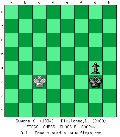 Last move : 0-1 2014 August 10 15:41:46 [Event "FICGS__CHESS__CLASS_B__000204"] [Site "FICGS"] [Date "2014.02.24"] [Round "1"] [White "Suwara,Kazimierz"] [Black "DiAlfonso,Darren"] [Result "0-1"] [WhiteElo "1834"] [BlackElo "2000"] 1.e4 e6 2.d4 d5 3.Nd2 c5 4.Ngf3 Nf6 5.exd5 exd5 6.Bb5+ Bd7 7.Bxd7+ Nbxd7 8.dxc5 Bxc5 9.Nb3 Bb6 10.O-O O-O 11.c3 Re8 12.Bg5 Rc8 13.Nbd4 Nc5 14.Re1 Nce4 15.Bxf6 Qxf6 16.Qb3 Rcd8 17.Re2 Re7 18.a4 g5 19.h3 h5 20.a5 Bc5 21.Nd2 g4 22.Nxe4 dxe4 23.hxg4 hxg4 24.Rd1 Rd6 25.Qc4 Re5 26.g3 Qh8 27.Rxe4 Rxe4 28.Qxc5 Qe5 29.Qc8+ Kh7 30.Kg2 Qd5 31.c4 Qg5 32.Rh1+ Rh6 33.Rxh6+ Qxh6 34.Qf5+ Qg6 35.Qd5 Re1 36.Nb5 Qe4+ 37.Qxe4+ Rxe4 38.Nd6 Rd4 39.c5 Kg6 40.Nxb7 Rb4 41.Nd6 Rxb2 42.Kf1 Rc2 43.Nb7 Kf5 44.Nd6+ Ke6 45.Nb7 f6 46.a6 Kd5 47.Kg2 Ra2 48.Nd6 Rxa6 49.Kf1 Rxd6 50.cxd6 Kxd6 51.Ke2 f5 52.Ke3 a5 53.Kd4 a4 54.Kc4 Ke5 55.Kb4 f4 56.Kxa4 fxg3 57.fxg3 Ke4 58.Kb3 Kf3 59.Kc3 Kxg3 0-1 French : Tarrasch, Open variation Kingside Castling by player White (move 10) Kingside Castling by player Black (move 10) 10 pieces endgame at move 48 : White KNPPP , Black KRPPP WHITE : King + 1 Knight 3 Pawns BLACK : King + 1 Rook 3 Pawns 9 pieces endgame at move 49 : White KPPP , Black KRPPP WHITE : King + 3 Pawns BLACK : King + 1 Rook 3 Pawns 8 pieces endgame at move 50 : White KPPP , Black KPPP WHITE : King + 3 Pawns BLACK : King + 3 Pawns 7 pieces endgame at move 50 : White KPP , Black KPPP WHITE : King + 2 Pawns BLACK : King + 3 Pawns 6 pieces endgame at move 56 : White KPP , Black KPP WHITE : King + 2 Pawns BLACK : King + 2 Pawns 5 pieces endgame at move 56 : White KP , Black KPP WHITE : King + 1 Pawn BLACK : King + 2 Pawns 4 pieces endgame at move 57 : White KP , Black KP WHITE : King + 1 Pawn BLACK : King + 1 Pawn 3 pieces endgame at move 59 : White K , Black KP WHITE : King + BLACK : King + 1 Pawn Player Black won this chess game. Follow this game move after move (download)We like to think. (Gary Kasparov) Das Schach hält seine Meister in eigenen Banden, Fesseln; auf vielerlei Weise formt es ihren Geist, so dass die innere Freiheit selbst des Stärksten beeinflusst wird. (Albert Einstein) Un jugador que trata de regresar una movida en el Ajedrez es un futuro carterista. (Richard Fenton) Si le désir cupide (et stupide) de gagner est une inépuisable source de souffrance, une combinaison brillante sur l'échiquier est une découverte : le coquelicot qui s'épanouit lorsque apparaît la Voie Lactée. (Arrabal) The next best thing to gambling and winning is gambling and loosing. (Nick Dandalos)