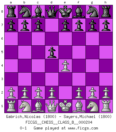 Last move : 0-1 2014 May 2 8:49:43 [Event "FICGS__CHESS__CLASS_B__000204"] [Site "FICGS"] [Date "2014.02.24"] [Round "1"] [White "Gabrich,Nicolas"] [Black "Sayers,Michael"] [Result "0-1"] [WhiteElo "1800"] [BlackElo "1800"] 1.e4 d5 0-1 This chess game has been lost on time (started : 2014.02.24 16:8:11) Scandinavian (centre counter) defense Player Black won this chess game. Follow this game move after move (download)The game of chess is the touchstone of the intellect. (Goethe) Wenn Spassky eine Figur opfert kannst du genauso gut aufgeben. Aber wenn Tal eine Figur opfert, spiel weiter. Er könnte noch eine weitere opfern, und dann ... wer weiß? (Miguel Najdorf) Yo siempre he tenido un ligero sentimiento de lástima por una persona que no tiene conocimiento del Ajedrez. (Siegbert Tarrasch) Tous ces prétendus hommes politiques sont les pions, les Cavaliers, les Tours ou les Fous d'une partie d'échecs qui se jouera tant qu'un hasard ne renversera pas l'échiquier. (Honoré de Balzac) I just play for fun. (Anna Kournikova)