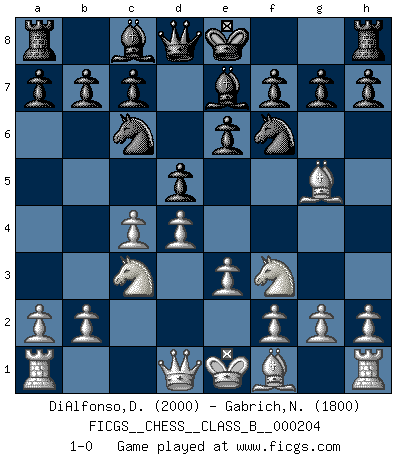 Last move : 1-0 2014 April 6 7:22:51 [Event "FICGS__CHESS__CLASS_B__000204"] [Site "FICGS"] [Date "2014.02.24"] [Round "1"] [White "DiAlfonso,Darren"] [Black "Gabrich,Nicolas"] [Result "1-0"] [WhiteElo "2000"] [BlackElo "1800"] 1.d4 Nf6 2.Nf3 e6 3.c4 d5 4.Nc3 Nc6 5.Bg5 Be7 6.e3 1-0 This chess game has been lost on time (started : 2014.02.24 16:8:11) Queen's pawn game Player White won this chess game. Follow this game move after move (download)All Chess players should have a hobby. (Savielly Tartakower) Im Schach nämlich geht es darum, daß Ich des Gegners klein zu kriegen, sein Ego zu zerbrechen und zu zermahlen, seine Selbstachtung zu zertreten und zu verscharren und seine ganze mißachtenswerte sogenannte Persönlichkeit ein für alle Mal tot zu hacken und zu zerstampfen und dadurch die menschliche Gesellschaft von einer stinkenden Pestbeule zu befreien. Es ist ein königliches Spiel. (Robert James Fischer) El Ajedrez es tan interesante por sí solo, que no es necesario un interés monetario para persuadir a una persona a que lo practique; por lo tanto, nunca se juega por dinero. (Benjamin Franklin) On peut tirer plus d'utilité d'une partie perdue que de 100 parties gagnées. (Capablanca) Creativity is inventing, experimenting, growing, taking risks, breaking rules, making mistakes, and having fun. (Mary Lou Cook)