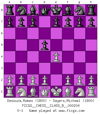 Last move : 0-1 2014 April 29 20:38:56 [Event "FICGS__CHESS__CLASS_B__000204"] [Site "FICGS"] [Date "2014.02.24"] [Round "1"] [White "Desouza,Romeo"] [Black "Sayers,Michael"] [Result "0-1"] [WhiteElo "1800"] [BlackElo "1800"] 1.e4 d5 0-1 This chess game has been lost on time (started : 2014.02.24 16:8:11) Scandinavian (centre counter) defense Player Black won this chess game. Follow this game move after move (download)I'm not afraid of Spassky. The world knows I'm the best. You don't need a match to prove it. (Bobby Fischer) Der Verteidiger gebe der Gewalt nach, aber nur der Gewalt. Er schaffe sich nicht freiwillig, etwa aus Blindheit oder aus Schrecken, irgendwelche Schwächen. Er lasse sich nicht bluffen. (Emanuel Lasker) El juego del Ajedrez no es solamente una diversión quieta; algunas cualidades muy valuables de la mente se pueden adquirir y cultivar con el, como convertirlos en habitos disponibles para toda ocasión; ya que la vida es algo así como el Ajedrez. (Benjamin Franklin) Le pion, dans sa simplicité, marche droit devant lui, mais lorsqu'il prend, il le fait obliquement? Ainsi l'homme, tant qu'il reste pauvre, marche dans la droiture et vit honnêtement, mais lorsqu'il recherche les honneurs, il flatte, se parjure et, par les voies obliques, cherche une position supérieure sur l'échiquier du monde. (Jean de Galles) I take risks, sometimes patients die, but not taking risks causes more patients to die. So I guess my biggest problem is I've been cursed with the ability to do the math. (Gregory House, House M.D.)