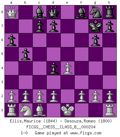 Last move : 1-0 2014 April 19 20:8:33 [Event "FICGS__CHESS__CLASS_B__000204"] [Site "FICGS"] [Date "2014.02.24"] [Round "1"] [White "Ellis,Maurice"] [Black "Desouza,Romeo"] [Result "1-0"] [WhiteElo "1844"] [BlackElo "1800"] 1.e4 e5 2.Nf3 Nc6 3.Bb5 Nd4 4.Nxd4 a6 5.Ba4 b5 6.Bb3 exd4 7.Bxf7+ Kxf7 8.Qh5+ g6 9.Qd5+ Kg7 10.Qxa8 1-0 This chess game has been lost on time (started : 2014.02.24 16:8:11) Ruy Lopez : Bird's defense Player White won this chess game. Follow this game move after move (download)Winning isn't everything... but losing is nothing. (Mednis) Die Neutralität betrachte ich als eine schwere Krankheit. (Viktor Kortschnoi) La belleza de un movimiento no se refleja solo en su apariencia, sino en el pensamiento detrás de él. (Siegbert Tarrasch) Un footballeur joue avec ses pieds, parfois avec sa tête. Un joueur d'échecs ne joue qu'avec sa tête. Et quand il ne joue plus, il meurt. (Jacob Murray) Players are not good because they find tactics, it is about the way to find the positions in which those tactics are hidden. (Luc-Olivier Leclerc)