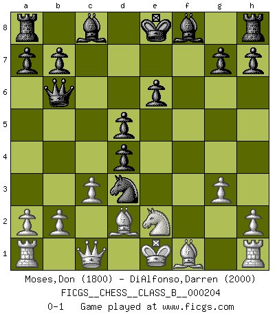 Last move : 0-1 2014 March 4 14:6:25 [Event "FICGS__CHESS__CLASS_B__000204"] [Site "FICGS"] [Date "2014.02.24"] [Round "1"] [White "Moses,Don"] [Black "DiAlfonso,Darren"] [Result "0-1"] [WhiteElo "1800"] [BlackElo "2000"] 1.e4 e6 2.d4 d5 3.Nc3 Nf6 4.e5 Nfd7 5.f4 c5 6.Nf3 Nc6 7.Bd2 cxd4 8.Ne2 Qb6 9.Qc1 f6 10.g3 fxe5 11.Nxe5 Ndxe5 12.fxe5 Nxe5 13.c3 Nd3+ 0-1 French : Steinitz variation Player Black won this chess game. Follow this game move after move (download)A sacrifice is best refuted by accepting it. (Wilhelm Steinitz) Über die Verhaftung Bobby Fischers: Warum es die Bush-Administration für nötig befindet einen 61 Jahre alten Mann zu hetzten, der für niemanden ausser sich selbste eine Gefahr darstellt ist ein Rätsel. (Nigel Short) Los Peones son nacidos libres, y aún así, se encuentran por doquier encadenados. (Rick Kennedy) Botvinnik disait en comparant les échecs à la musique: Il existe une science dont le but est l'étude de l'acoustique et des sons. Mais il y a aussi un art qui se sert de l'océan des sons : c'est la musique. De toute évidence, il en est de même pour la pensée. La logique est l'étude des lois de la réflexion et les échecs reflètent, en tant qu'art, le côté logique de la réflexion, sous la forme d'images artistiques... Extrait de Fischer - Spassky, Reykjavik 1972 par Alexander & F. Wyndham (Ed. Solar), p 37. Whenever people agree with me, I always feel I must be wrong. (Oscar Wilde)