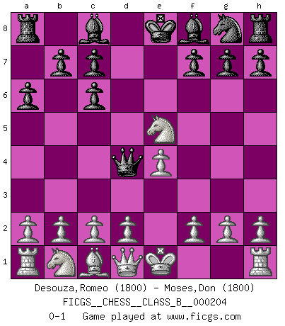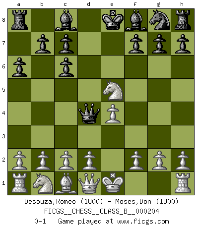 Last move : 0-1 2014 April 21 20:13:2 [Event "FICGS__CHESS__CLASS_B__000204"] [Site "FICGS"] [Date "2014.02.24"] [Round "1"] [White "Desouza,Romeo"] [Black "Moses,Don"] [Result "0-1"] [WhiteElo "1800"] [BlackElo "1800"] 1.e4 e5 2.Nf3 Nc6 3.Bb5 a6 4.Bxc6 dxc6 5.Nxe5 Qd4 0-1 This chess game has been lost on time (started : 2014.02.24 16:8:11) Ruy Lopez : Exchange variation Player Black won this chess game. Follow this game move after move (download)When in doubt... play Chess ! (Tevis) Zu meiner Zeit war ein 20 jähriger ein junger Spieler, heute ist er ein Veteran. (Garry Kasparov) La caracteristica mas importante en la posición del Ajedrez es la actividad de las piezas. Esto es absolutamente fundamental en todas las fases del juego: Apertura, Juego Medio y especialmente Finales. La limitación primordial en la actividad de una pieza, es la estructuración de los Peones. (Michael Stean) Je fais ceci parce que dans cinquante coups j'obtiendrai cela; je m'appelle Mikhail Moisevitch Botvinnik. (Botvinnik) Life is pain my dear and anyone who says otherwise is selling something. (Princess Bride)