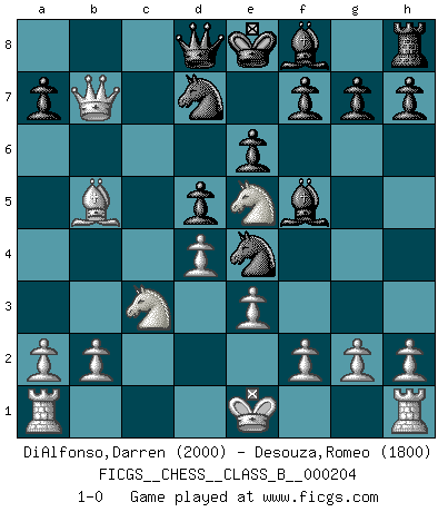 Last move : 1-0 2014 May 5 16:27:13 [Event "FICGS__CHESS__CLASS_B__000204"] [Site "FICGS"] [Date "2014.02.24"] [Round "1"] [White "DiAlfonso,Darren"] [Black "Desouza,Romeo"] [Result "1-0"] [WhiteElo "2000"] [BlackElo "1800"] 1.d4 d5 2.c4 c6 3.Nf3 Nf6 4.Nc3 Bf5 5.cxd5 cxd5 6.Qb3 e6 7.Qxb7 Nbd7 8.Bf4 Ne4 9.e3 Rb8 10.Bxb8 Nxb8 11.Bb5+ Nd7 12.Ne5 1-0 QGD Slav : 4.Nc3 Player White won this chess game. Follow this game move after move (download)If your opponent offers you a draw, try to work out why he thinks he's worse off. (Nigel Short) Ein typischer, sehr verbreiteter Gedankenschädling ist der, daß der betreffende Amateur von der Annanhme ausgeht, daß jeder einzelne Zug etwas zu leisten habe. (Aaron Nimzowitsch) Las combinaciones han sido siempre el aspecto más intrigante del Ajedrez. Los Maestros las buscan, el público las aplauden, los críticos las alaban. La razón se debe a que las combinaciones hacen posible que el Ajedrez sea más que un ejercicio matemático con una carencia de vida. Ellas son la poesía del juego, son del Ajedrez lo que la melodía es de la música. Ellas representan el triunfo de la mente sobre la materia. (Reuben Fine) Nous sommes les pions de la mystérieuse partie d'Echecs jouée par Dieu. Il nous déplace, nous arrête, nous pousse encore, puis nous lance un à un dans la boîte du Néant. Epitaphe sur la tombe de David Janowsky (1868-1927). I have opinions of my own - strong opinions - but I don't always agree with them. (George Bush)