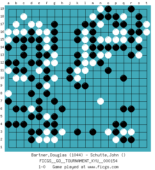 Last move : 1-0 2014 March 24 17:31:32 [Event "FICGS__GO__TOURNAMENT_KYU__000154"] [Site "FICGS"] [Date "2014.02.24"] [Round "1"] [Black "Bartner,Douglas"] [White "Schutte,John"] [Result "1-0"] [Rating 1 "1044"] 1.q17 d4 2.d16 e4 3.p4 d17 4.c17 e16 5.d15 e17 6.b4 c18 7.c6 d14 8.c14 d13 9.c13 c12 10.e15 f15 11.d12 b17 12.c15 b13 13.c11 b12 14.e12 c16 15.e14 e13 16.f13 d13 17.b11 b14 18.b15 a15 19.a12 a13 20.a14 a16 21.k16 d11 22.d8 b5 23.b6 d14 24.c4 f14 25.r15 q15 26.r16 s15 27.s16 q16 28.p17 q18 29.p18 p19 30.o19 q19 31.n18 n19 32.o18 p16 33.m16 r14 34.q14 t16 35.s14 s13 36.r13 c5 37.d5 a5 38.e5 b16 39.f4 f3 40.g4 c12 41.b12 f5 42.g3 d6 43.e6 f6 44.e7 f7 45.f8 h3 46.g7 e8 47.e9 g13 48.r6 f12 49.e13 e11 50.f11 g12 51.f10 l11 52.q10 n13 53.p14 c10 54.g17 a11 55.m3 n7 56.q6 b10 57.j11 a6 58.a7 a8 59.a4 e10 60.k9 f9 61.k13 p15 62.o14 m18 63.m17 r17 64.s17 r18 65.s18 t17 66.g16 g10 67.d10 n17 68.r19 q18 69.g15 g2 70.g5 g6 71.h6 o15 72.n14 k10 73.j10 f16 74.g14 n15 75.m15 l16 76.l17 l15 77.k15 l14 78.m14 l13 79.m13 m12 80.o11 f5 81.l9 e11 82.e3 f2 83.d3 e2 84.d2 o13 85.n12 l12 86.k12 k11 87.k3 o3 88.p3 p2 89.q2 q3 90.q4 r3 91.r2 1-0 Here are the names of the openings (joseki) played in the four corners : Corner d16 : d16 d17 Hoshi (Hwajeom, Seongjeom, Xingwei`) 4-4 Point. The star or hoshi (4-4) point, emphasizing influence at the potential expense of territory. Player Black won this Go (weiqi, baduk) game. Follow this game move after move (download)There is damezumari at the bamboo joint. (Anonymous) Do not put your faith in what statistics say until you have carefully considered what they do not say. (William W. Watt)