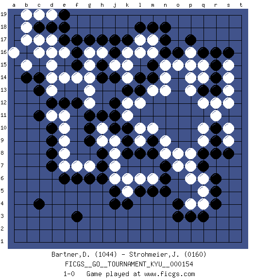Last move : 1-0 2014 September 13 2:18:29 [Event "FICGS__GO__TOURNAMENT_KYU__000154"] [Site "FICGS"] [Date "2014.02.24"] [Round "1"] [Black "Bartner,Douglas"] [White "Strohmeier,Josef"] [Result "1-0"] [Rating 1 "1044"] [Rating 2 "0160"] 1.q16 q4 2.c4 d16 3.f3 p13 4.r6 q6 5.q7 q5 6.r5 e14 7.r13 r12 8.q13 q12 9.k17 k15 10.r4 q14 11.r14 p14 12.o16 o15 13.n16 n15 14.o3 q15 15.r15 s13 16.r16 s14 17.q3 p4 18.p3 p7 19.q8 p8 20.o4 p6 21.k4 q9 22.g17 g16 23.f16 g15 24.h17 h16 25.f15 f14 26.c14 d13 27.b16 d14 28.c13 d15 29.d12 g14 30.d9 e9 31.d8 e8 32.d7 s15 33.s16 s12 34.f12 e10 35.d10 e11 36.e12 d11 37.c11 p16 38.p17 p15 39.f6 g7 40.g6 f7 41.h6 j6 42.h7 m16 43.j5 k6 44.h8 e7 45.e6 g12 46.g11 g13 47.h11 k5 48.j4 h9 49.g9 h10 50.g10 j9 51.m5 m6 52.l5 l6 53.n18 m17 54.m18 l17 55.l18 l16 56.r9 q10 57.r10 r11 58.s8 k16 59.j17 c16 60.e17 d17 61.j11 j8 62.n6 j7 63.n7 n8 64.m8 n9 65.m9 m10 66.k10 l10 67.k9 l9 68.l8 o8 69.k8 o7 70.n5 b15 71.d18 b17 72.b14 a16 73.k13 k12 74.j12 l12 75.j14 k14 76.l13 m13 77.c18 b18 78.l14 c17 79.m14 n13 80.m15 n14 81.j16 j15 82.h14 s10 83.h15 s9 84.r8 k11 85.j10 e16 86.f17 c19 87.e18 d19 88.e19 b19 89.n17 1-0 Here are the names of the openings (joseki) played in the four corners : Corner q16 : q16 p13 Hoshi (Hwajeom, Seongjeom, Xingwei`) 4-4 Point. The star or hoshi (4-4) point, emphasizing influence at the potential expense of territory. Corner q4 : q4 r6 Hoshi (Hwajeom, Seongjeom, Xingwei`) 4-4 Point. The star or hoshi (4-4) point, emphasizing influence at the potential expense of territory. Ikken Kakari (Hankan Keolch'im, Yi Gua`jiao~, 1-Space Low Approach). Black 2 is the standard approach move to the 4-4. Player Black won this Go (weiqi, baduk) game. Follow this game move after move (download)The game plays itself, the players don't control it. (Pierre Audouard) The man who strikes first admits that his ideas have given out. (Chinese proverb)