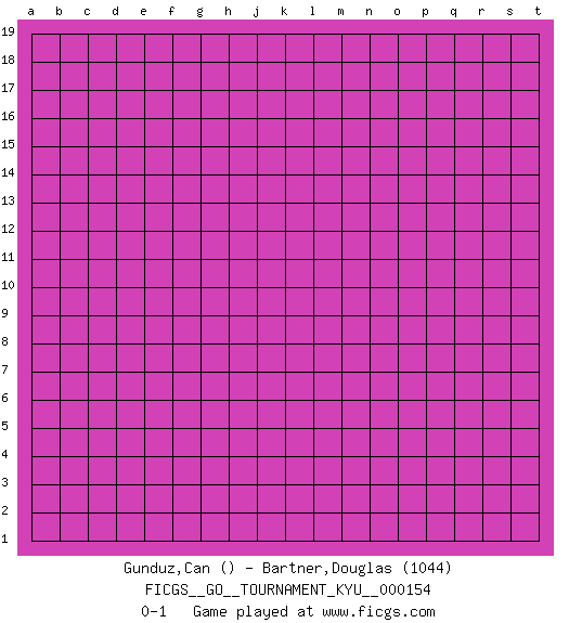 Last move : 0-1 2014 March 26 16:53:7 [Event "FICGS__GO__TOURNAMENT_KYU__000154"] [Site "FICGS"] [Date "2014.02.24"] [Round "1"] [Black "Gunduz,Can"] [White "Bartner,Douglas"] [Result "0-1"] [Rating 2 "1044"] 0-1 This go game has been lost on time (started : 2014.02.24 16:47:43) Here are the names of the openings (joseki) played in the four corners : Player White won this Go (weiqi, baduk) game. Follow this game move after move (download)On the second line six die, eight live. (Anonymous) You can't play chess if you're groggy from pills. (Anatoly Karpov)