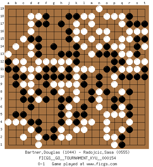 Last move : 0-1 2014 May 15 17:10:39 [Event "FICGS__GO__TOURNAMENT_KYU__000154"] [Site "FICGS"] [Date "2014.02.24"] [Round "1"] [Black "Bartner,Douglas"] [White "Radojcic,Sasa"] [Result "0-1"] [Rating 1 "1044"] [Rating 2 "0555"] 1.q16 c4 2.q4 d17 3.e3 d3 4.e4 e2 5.f2 e1 6.d4 c2 7.j3 q14 8.c5 b4 9.d6 q11 10.n17 r16 11.r17 s16 12.s17 t16 13.r10 r11 14.q10 l3 15.k4 l4 16.r6 d14 17.f17 e18 18.f18 o3 19.p3 o4 20.c10 c12 21.e10 k17 22.h17 m17 23.k5 n16 24.o17 l16 25.e17 d18 26.e15 d16 27.d15 c15 28.e14 d13 29.j16 q15 30.p16 o15 31.l5 m4 32.e13 e12 33.f11 f12 34.g11 g12 35.g14 n6 36.m7 n7 37.m8 k8 38.l9 j9 39.j11 k10 40.j10 k9 41.l10 k11 42.g8 j6 43.h7 k7 44.h6 j5 45.h5 j4 46.h4 k3 47.l6 h3 48.g3 h2 49.n10 g9 50.f9 h8 51.b5 a4 52.p7 q6 53.q7 p5 54.r5 p2 55.q2 p1 56.q1 o2 57.o11 p10 58.p11 p9 59.o8 q8 60.r8 n8 61.n9 m11 62.s10 s11 63.t11 t12 64.t10 s12 65.p13 q13 66.n13 m13 67.p15 p14 68.o14 n14 69.o13 m15 70.s14 r15 71.q12 r12 72.s13 t14 73.p12 r13 74.s15 o16 75.b11 b12 76.a12 a13 77.a11 b14 78.t17 q17 79.p17 q18 80.r18 p18 81.n18 o18 82.k13 l11 83.g2 j2 84.h13 j12 85.k12 h12 86.j13 h11 87.g10 h9 88.h10 e11 89.f10 c11 90.b9 d10 91.e8 c9 92.b10 d9 93.c8 d8 94.c7 e7 95.f7 d11 96.d7 l14 97.k14 k15 98.j15 k16 99.j18 m18 100.k18 l18 101.p6 q5 102.p4 o5 103.j7 r4 104.t15 n19 105.r3 q3 0-1 Here are the names of the openings (joseki) played in the four corners : Corner d4 : c4 e3 Komoku (Somok, Xiao~mu`) 3-4 Point. The komoku (3-4) point is the traditional corner enclosure move.. Ikken Kakari (Hankan Keolch'im, Yi Gua`jiao~, 1-Space Low Pincer). The small knight move is the basic approach move to the 3-4 point stone. It has been continually used for over four centuries. There are limitless variations, with new moves constantly being discovered. Black 2 opens the door to a treaure store of joseki. Corner q16 : q16 q14 Hoshi (Hwajeom, Seongjeom, Xingwei`) 4-4 Point. The star or hoshi (4-4) point, emphasizing influence at the potential expense of territory. Ikken Takagakari (Hankan Nop'dakeolch'im, Yi Gaojia, 1-Space High Approach). Black typically responds at 6-4 or 3-10. Black 4-10 is played when Black finds play on the right side advantageous. Black 4-8 or 3-8 may be played when Black has support at top. Corner q4 : q4 l3 Hoshi (Hwajeom, Seongjeom, Xingwei`) 4-4 Point. The star or hoshi (4-4) point, emphasizing influence at the potential expense of territory. Player White won this Go (weiqi, baduk) game. Follow this game move after move (download)Empty triangles are bad. (Anonymous) I think your argument is specious - I think your tie is ugly. (Gregory House to Dr. Foreman, House M.D.)