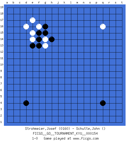 Last move : 1-0 2014 April 7 18:49:0 [Event "FICGS__GO__TOURNAMENT_KYU__000154"] [Site "FICGS"] [Date "2014.02.24"] [Round "1"] [Black "Strohmeier,Josef"] [White "Schutte,John"] [Result "1-0"] [Rating 1 "0160"] 1.d4 q16 2.q4 d16 3.e13 e14 4.f14 e15 5.f15 f16 6.g16 g14 7.g15 e17 8.h14 g13 9.f13 1-0 Here are the names of the openings (joseki) played in the four corners : Corner d16 : d16 e13 Hoshi (Hwajeom, Seongjeom, Xingwei`) 4-4 Point. The star or hoshi (4-4) point, emphasizing influence at the potential expense of territory. Corner d4 : d4 1-0 Hoshi (Hwajeom, Seongjeom, Xingwei`) 4-4 Point. The star or hoshi (4-4) point, emphasizing influence at the potential expense of territory. Player Black won this Go (weiqi, baduk) game. Follow this game move after move (download)Only amateurs try to come up with fancy moves. (Anonymous) I can't decide which is riskier; taking crazy risks, or taking advice on crazy risks from a crazy risk taker. (Gregory House in House M.D.)