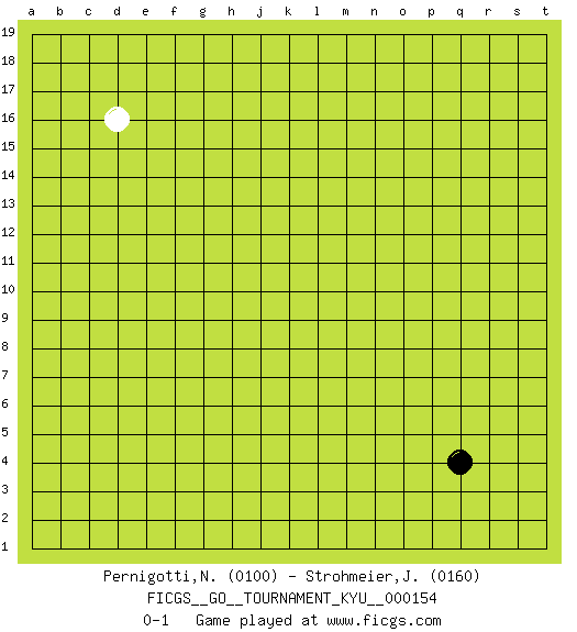 Last move : 0-1 2014 March 29 17:43:56 [Event "FICGS__GO__TOURNAMENT_KYU__000154"] [Site "FICGS"] [Date "2014.02.24"] [Round "1"] [Black "Pernigotti,Nico"] [White "Strohmeier,Josef"] [Result "0-1"] [Rating 1 "0100"] [Rating 2 "0160"] 1.q4 d16 0-1 This go game has been lost on time (started : 2014.02.24 16:47:43) Here are the names of the openings (joseki) played in the four corners : Player White won this Go (weiqi, baduk) game. Follow this game move after move (download)In an unreasonable situation, an unreasonable move is reasonable. (Tamino) 'preceded by its own quotation yields a falsehood' preceded by its own quotation yields a falsehood. (W. V. O. Quine - Set Theory And Its Logic, 1953)