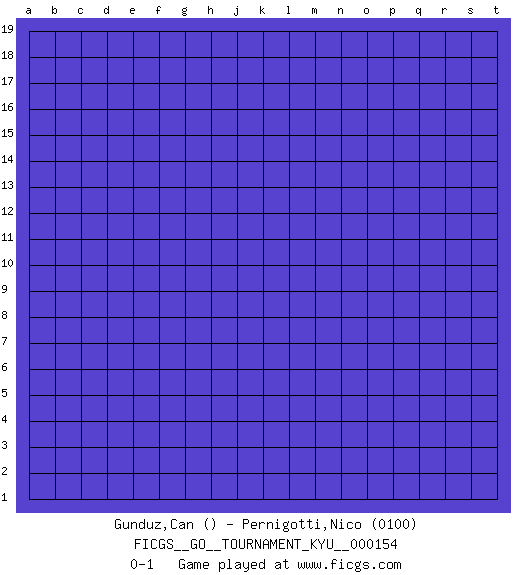Last move : 0-1 2014 March 26 16:53:7 [Event "FICGS__GO__TOURNAMENT_KYU__000154"] [Site "FICGS"] [Date "2014.02.24"] [Round "1"] [Black "Gunduz,Can"] [White "Pernigotti,Nico"] [Result "0-1"] [Rating 2 "0100"] 0-1 This go game has been lost on time (started : 2014.02.24 16:47:43) Here are the names of the openings (joseki) played in the four corners : Player White won this Go (weiqi, baduk) game. Follow this game move after move (download)The saki bottle shape is negative. (Anonymous) Every now and then a man's mind is stretched by a new idea and never shrinks back to its former dimensions. (Oliver Wendell Holmes, Sr.)