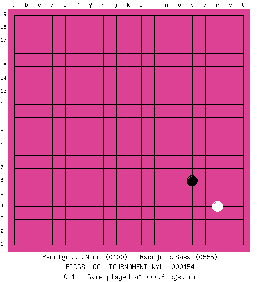 Last move : 0-1 2014 March 28 5:10:4 [Event "FICGS__GO__TOURNAMENT_KYU__000154"] [Site "FICGS"] [Date "2014.02.24"] [Round "1"] [Black "Pernigotti,Nico"] [White "Radojcic,Sasa"] [Result "0-1"] [Rating 1 "0100"] [Rating 2 "0555"] 1.p6 r4 0-1 This go game has been lost on time (started : 2014.02.24 16:47:43) Here are the names of the openings (joseki) played in the four corners : Corner q4 : p6 r4 This joseki is unknown. A weak or weird move has probably been played in this corner. Player White won this Go (weiqi, baduk) game. Follow this game move after move (download)Go is to western chess what philosophy is to double entry accounting. (from Shibumi, by Trevanian) I teach you to lie, cheat and steal, and as soon as my back's turned you wait in line ? (Gregory House, House M.D.)