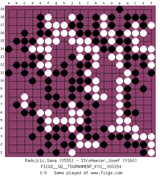 Last move : 1-0 2014 September 13 2:17:29 [Event "FICGS__GO__TOURNAMENT_KYU__000154"] [Site "FICGS"] [Date "2014.02.24"] [Round "1"] [Black "Radojcic,Sasa"] [White "Strohmeier,Josef"] [Result "1-0"] [Rating 1 "0555"] [Rating 2 "0160"] 1.c16 q4 2.d3 q16 3.f16 g3 4.f3 f4 5.f2 g2 6.e4 f5 7.e5 f1 8.e1 e6 9.g1 g15 10.g4 g5 11.h4 h3 12.j3 j4 13.h2 h5 14.d6 f6 15.d7 f15 16.e16 k3 17.k4 j5 18.l3 k2 19.l4 l2 20.m3 m2 21.n2 g16 22.o3 e15 23.d15 d14 24.c14 c13 25.d13 e14 26.c12 q10 27.q3 r3 28.q2 p4 29.p3 o4 30.n4 b13 31.d12 d11 32.b12 k10 33.k16 k15 34.l16 l15 35.m16 n16 36.m15 m14 37.n15 o16 38.n14 b14 39.c15 e12 40.e13 f13 41.e11 f12 42.d10 m13 43.c11 j16 44.j17 j15 45.q8 p8 46.q7 p7 47.q6 p6 48.q9 p9 49.r10 p10 50.r11 q11 51.q12 p12 52.q13 p13 53.q14 r14 54.r13 r15 55.p15 o15 56.o14 p14 57.p16 p17 58.q15 h16 59.q17 r16 60.o17 n17 61.o18 p18 62.q18 p5 63.p19 f17 64.e17 g17 65.e18 f18 66.b15 o13 67.m17 q5 68.r6 f14 69.j8 k8 70.j9 j7 71.k9 l9 72.j10 j11 73.l10 m10 74.k11 l11 75.k10 h8 76.l8 m9 77.k7 k6 78.l6 k5 79.l5 m8 80.m7 n8 81.h7 j6 82.g8 h9 83.g7 g9 84.f8 h10 85.k12 k13 86.h11 j12 87.f9 g10 88.g11 f11 89.f10 s14 90.l12 m12 91.l13 l14 92.j13 k14 93.h12 n18 94.m18 r4 95.r2 s3 96.s2 t3 97.s13 t14 98.s17 r17 99.r18 t13 100.s9 s16 101.s18 t17 102.s12 t12 103.t11 t2 104.j2 j1 105.g3 j18 106.k18 h17 107.k17 t1 108.s1 a12 109.a11 a13 110.a14 c8 111.b7 c7 112.c6 1-0 Here are the names of the openings (joseki) played in the four corners : Corner d4 : d3 g3 Komoku (Somok, Xiao~mu`) 3-4 Point. The komoku (3-4) point is the traditional corner enclosure move.. Corner q4 : q4 l3 Hoshi (Hwajeom, Seongjeom, Xingwei`) 4-4 Point. The star or hoshi (4-4) point, emphasizing influence at the potential expense of territory. Corner q16 : q16 l16 Hoshi (Hwajeom, Seongjeom, Xingwei`) 4-4 Point. The star or hoshi (4-4) point, emphasizing influence at the potential expense of territory. Player Black won this Go (weiqi, baduk) game. Follow this game move after move (download)The poor player plays the opponent's game for him. (Anonymous) Control your own destiny or someone else will. (Jack Welch)