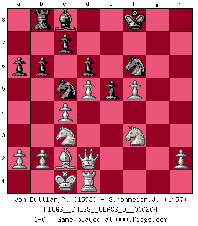 Last move : 1-0 2014 August 15 15:11:22 [Event "FICGS__CHESS__CLASS_D__000204"] [Site "FICGS"] [Date "2014.02.25"] [Round "1"] [White "von Buttlar,Paul"] [Black "Strohmeier,Josef"] [Result "1-0"] [WhiteElo "1593"] [BlackElo "1457"] 1.c4 Nf6 2.Nc3 g6 3.e4 d6 4.d4 Bg7 5.f3 Nbd7 6.Be3 O-O 7.Bd3 e5 8.d5 a6 9.Nge2 Nc5 10.Bc2 b6 11.Qd2 Ne8 12.g4 Qh4+ 13.Ng3 f5 14.Bg5 Qh3 15.exf5 gxf5 16.gxf5 h6 17.Be3 Nf6 18.O-O-O Rb8 19.Rhg1 Kf7 20.Nge4 Qxf3 21.Rxg7+ Kxg7 22.Bxh6+ Kf7 23.Ng5+ Ke7 24.Bxf8+ Kxf8 25.Nxf3 1-0 English Opening Kingside Castling by player Black (move 6) Queenside Castling by player White (move 18) Player White won this chess game. Follow this game move after move (download)First-class players lose to second-class players because second-class players sometimes play a first-class game. (Siegbert Tarrasch) Schach ist Kampf, hauptsächlich jedoch gegen die eigenen Fehler. (Savielly Grigorievitsch Tartakower) Los Peones son el alma de una partida de Ajedrez. (Francois Andre Danican Philidor) Plusieurs personnes se sont demandées comment Tal faisait pour gagner... En fait, c'est très simple ! Il met ses pièces au centre de l'échiquier et les sacrifie quelque part ! (David Bronstein) There are lots of people who mistake their imagination for their memory. (Josh Bilings)
