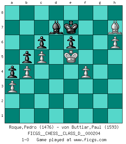 Last move : 1-0 2014 July 13 10:38:36 [Event "FICGS__CHESS__CLASS_D__000204"] [Site "FICGS"] [Date "2014.02.25"] [Round "1"] [White "Roque,Pedro"] [Black "von Buttlar,Paul"] [Result "1-0"] [WhiteElo "1476"] [BlackElo "1593"] 1.Nf3 d5 2.d4 c6 3.c4 e6 4.Nc3 Nf6 5.e3 Nbd7 6.Qc2 Bd6 7.Bd3 dxc4 8.Bxc4 b5 9.Be2 a6 10.Nd2 Bb7 11.Nce4 Nxe4 12.Nxe4 Be7 13.O-O Rc8 14.Nc5 Nxc5 15.dxc5 a5 16.Rd1 Qc7 17.b3 O-O 18.a3 Rcd8 19.Bb2 Rxd1+ 20.Bxd1 Rd8 21.b4 a4 22.f4 Qd7 23.Bd4 Bf6 24.Bxf6 gxf6 25.Be2 Qd2 26.Qxd2 Rxd2 27.Kf2 f5 28.e4 fxe4 29.Ke3 Rd5 30.Kxe4 f5+ 31.Ke3 Kf7 32.Bf3 Rd8 33.Rg1 Kf6 34.g4 fxg4 35.Rxg4 Rd7 36.Rh4 Kg7 37.Be4 Kg8 38.Rh6 Re7 39.Kd4 Kf8 40.Ke5 Rf7 41.Rxh7 Rxh7 42.Bxh7 Ke7 43.h4 Bc8 44.h5 Bd7 45.h6 1-0 Reti Opening Kingside Castling by player White (move 13) Kingside Castling by player Black (move 17) Player White won this chess game. Follow this game move after move (download)It is peculiar but a fact nevertheless, that gamblers in chess always have enthusiastic followers. (Botvinnik) Die FIDE ist dabei in die Hände der russischen Mafia zu fallen. (Larry Evans) Bobby es la celebridad menos entendida y malinterpretada que camina el la faz de esta tierra. (Yasser Seirawan) Mon pion favori sur ma case favorite ! Bronstein en parlant d'un coup de pion en h5 quand il avait les Noirs. When I took office, only high energy physicists had ever heard of what is called the World Wide Web... Now even my cat has its own page. (Bill Clinton, 1996)