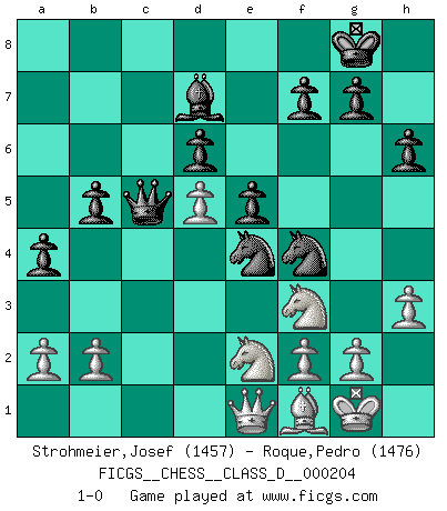 Last move : 1-0 2014 September 25 8:28:20 [Event "FICGS__CHESS__CLASS_D__000204"] [Site "FICGS"] [Date "2014.02.25"] [Round "1"] [White "Strohmeier,Josef"] [Black "Roque,Pedro"] [Result "1-0"] [WhiteElo "1457"] [BlackElo "1476"] 1.e4 e5 2.Nf3 Nc6 3.Bb5 a6 4.Ba4 Nf6 5.O-O Be7 6.Re1 b5 7.Bb3 d6 8.c3 O-O 9.h3 Na5 10.Bc2 c5 11.d4 Qc7 12.Nbd2 cxd4 13.cxd4 Nc6 14.Nb3 a5 15.Be3 a4 16.Nbd2 Bd7 17.Rc1 Qb7 18.Nf1 Rfe8 19.Bb1 Bd8 20.Ng3 Ba5 21.Re2 h6 22.d5 Ne7 23.Bd3 Rac8 24.Rec2 Rxc2 25.Rxc2 Ng6 26.Bd2 Bxd2 27.Qxd2 Nf4 28.Bf1 Rc8 29.Ne2 Nxe4 30.Rxc8+ Qxc8 31.Qd1 Qc5 32.Qe1 1-0 Ruy Lopez : Closed Kingside Castling by player White (move 5) Kingside Castling by player Black (move 8) Player White won this chess game. Follow this game move after move (download)It began to feel as though you were playing against Chess itself. - On playing against Robert Fischer. (Walter Shipman) Ich habe die Schachforschung dermaßen betrieben, dass sie auf eine wissenschaftliche Basis gestellt wurde. (Mikhail Moiseyevich Botvinik) El Ajedrez no es una pizca de inferior al violín, y tenemos un gran número de violinistas profesionales. (Mikhail Botvinnik) Des idées, des idées, j'en ai cent, j'en ai mille. Des bonnes, des mauvaises, applicables, irréalisables... Il suffit de faire le tri ! (Roos) A mistake is only a mistake if you let it happen twice. Otherwise it is a learning experience. (Daniel Parmet)
