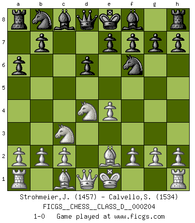 Last move : 1-0 2014 April 21 20:13:2 [Event "FICGS__CHESS__CLASS_D__000204"] [Site "FICGS"] [Date "2014.02.25"] [Round "1"] [White "Strohmeier,Josef"] [Black "Calvello,Simone"] [Result "1-0"] [WhiteElo "1457"] [BlackElo "1534"] 1.e4 c5 2.Nf3 d6 3.d4 cxd4 4.Nxd4 Nf6 5.Nc3 a6 6.Be2 1-0 This chess game has been lost on time (started : 2014.02.25 4:27:29) Sicilian : Najdorf, Opovcensky variation Player White won this chess game. Follow this game move after move (download)I believe that Chess possesses a magic that is also a help in advanced age. A rheumatic knee is forgotten during a game of Chess and other events can seem quite unimportant in comparison with a catastrophe on the chessboard. (Vlastimil Hort) Frage: Wie viele Autos haben Sie schon zerstört? - Antwort: Nur zwei. (Loek van Wely) El Rey es una pieza de pelea. ¡Usenlo!. (Wilhelm Steinitz) Les Echecs sont affaire de jugement sensible. Savoir quand frapper et quand esquiver. (Fischer) CHESS, n. f. [echecs, Fr.] A nice and abstruse game, in which two sets of puppets are moved in opposition to each other. (Dr Samuel Johnson, A Dictionary Of The English Language, 1755)