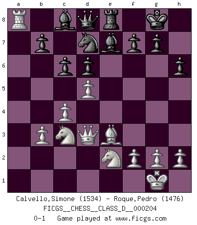 Last move : 0-1 2014 May 10 9:13:13 [Event "FICGS__CHESS__CLASS_D__000204"] [Site "FICGS"] [Date "2014.02.25"] [Round "1"] [White "Calvello,Simone"] [Black "Roque,Pedro"] [Result "0-1"] [WhiteElo "1534"] [BlackElo "1476"] 1.e4 Nf6 2.e5 Nd5 3.d4 d6 4.c4 Nb6 5.exd6 exd6 6.Nc3 Nc6 7.Be3 Be7 8.Bd3 O-O 9.Nge2 Nb4 10.b3 a5 11.O-O a4 12.Qd2 Nxd3 13.Qxd3 Re8 14.Rfe1 c6 15.d5 axb3 16.axb3 Rxa1 17.Rxa1 Nd7 18.Ra8 h6 0-1 Alekhine's defense : Exchange variation Kingside Castling by player Black (move 8) Kingside Castling by player White (move 11) Player Black won this chess game. Follow this game move after move (download)Live, lose, and learn, by observing your opponent how to win. (Amber Steenbock) Die meiste Zeit treffe ich auf Gegner, die meine Enkel sein könnten. Ich bin da, um ihnen zu zeigen, dass sie von mir noch einiges lernen können. (Viktor Kortschnoi) Un mal plan es mejor que no tener ningún plan. (Frank Marshall) Il vaut mieux sacrifier les pièces de l'adversaire. (Xavier Tartacover) Coffee just isn't my cup of tea. (Unknown)