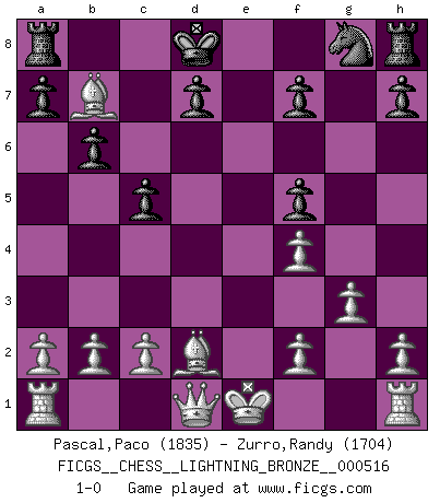 Last move : 1-0 2014 February 27 5:35:16 [Event "FICGS__CHESS__LIGHTNING_BRONZE__000516"] [Site "FICGS"] [Date "2014.02.27"] [Round "1"] [White "Pascal,Paco"] [Black "Zurro,Randy"] [Result "1-0"] [WhiteElo "1835"] [BlackElo "1704"] 1.d4 Nc6 2.Nf3 e5 3.e3 e4 4.d5 Nb4 5.Bd2 b6 6.Nd4 c5 7.Nf5 Nxd5 8.Nc3 Nf4 9.g3 g6 10.Nd6+ Bxd6 11.exf4 Ba6 12.Bxa6 Qf6 13.Nxe4 Qf5 14.Nxd6+ Kd8 15.Nxf5 gxf5 16.Bb7 1-0 Queen's pawn : Lundin (Kevitz-Mikenas) defense Player White won this chess game. Follow this game move after move (download)Dazzling combinations are for the many, shifting wood is for the few. (Georg Kieninger) Viele Opfer benötigen überhaupt keine konkrete Berechnung. Es genügt sich die entstehende Position kurz vorzustellen, um uns davon zu überzeugen, dass das Opfer korrekt ist. (Mikhail Nekhemyevich Tal) Mi estilo es algo parecido entre un poco de Tal y Petrosian. (Reshevsky) Il n'y a pas eu de défaite parce que je ne crois pas que cet ordinateur ait jamais existé. IBM a triché en refusant d'imprimer les modes de recherche de la machine. C'est évident, pendant le match, des coups décisifs ont été joués par des êtres humains. Aujourd'hui, les meilleurs spécialistes en informatique ne peuvent toujours pas expliquer comment Deep-Blue a pu jouer contre la logique des ordinateurs. IBM a gagné une guerre de communication, mais ils sont incapables de prouver que l'ordinateur a gagné tout seul. (Garry Kasparov) The Movers & Shakers of this world are those who play chess in the mornings and go to the disco in the evenings. (Dinesh De Silva)