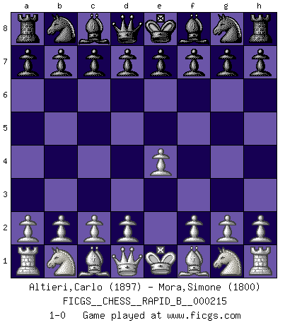 Last move : 1-0 2014 March 30 18:57:6 [Event "FICGS__CHESS__RAPID_B__000215"] [Site "FICGS"] [Date "2014.02.28"] [Round "1"] [White "Altieri,Carlo"] [Black "Mora,Simone"] [Result "1-0"] [WhiteElo "1897"] [BlackElo "1800"] 1.e4 1-0 This chess game has been lost on time (started : 2014.02.28 16:48:55) King's pawn Opening Player White won this chess game. Follow this game move after move (download)The beauty of a move lies not in its' appearance but in the thought behind it. (Siegbert Tarrasch) Auf jeden Fall musst du zuerst Rechtsanwalt werden, damit du deine eigenen Interessen und die deiner Familie vertreten kannst. [Brief an seinen Sohn] (José Raúl Capablanca) No todos los artistas son jugadores de Ajedrez, pero todos los jugadores de Ajedrez son artistas. (Marcel Duchamp) Dieu déplace le joueur, et celui-ci la pièce. Quel Dieu derrière Dieu commence donc la trame ? Arturo Perez-Reverte (prix de littérature policière 1993). A bird doesn't sing because it has an answer, it sings because it has a song. (Maya Angelou)