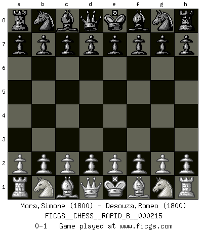 Last move : 0-1 2014 March 30 18:55:19 [Event "FICGS__CHESS__RAPID_B__000215"] [Site "FICGS"] [Date "2014.02.28"] [Round "1"] [White "Mora,Simone"] [Black "Desouza,Romeo"] [Result "0-1"] [WhiteElo "1800"] [BlackElo "1800"] 0-1 This chess game has been lost on time (started : 2014.02.28 16:48:55) Player Black won this chess game. Follow this game move after move (download)Chess is no whit inferior to the violin, and we have a large number of professional violinists. (Mikhail Botvinnik) Schach verlangt totale Konzentration. (Robert James Fischer) Ayuda a tus piezas para que ellas te puedan ayudar. (Paul Morphy) Le thème de l'attaque double intervient d'une manière ou d'une autre dans l'immense majorité des combinaisons. (Youri Averbakh) Some people are so afraid to die that they never begin to live. (Henry Van Dyke)