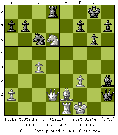 Last move : 0-1 2014 May 26 11:41:6 [Event "FICGS__CHESS__RAPID_B__000215"] [Site "FICGS"] [Date "2014.02.28"] [Round "1"] [White "Hilbert,Stephan J."] [Black "Faust,Dieter"] [Result "0-1"] [WhiteElo "1713"] [BlackElo "1730"] 1.b4 g6 2.Bb2 Nf6 3.c4 d6 4.e3 Bg7 5.Nf3 O-O 6.d4 e5 7.Be2 exd4 8.Nxd4 c5 9.Nc2 cxb4 10.Nxb4 Nc6 11.Nd5 Nxd5 12.Bxg7 Nxe3 13.fxe3 Kxg7 14.O-O Qe7 15.Qd2 Re8 16.Qc3+ Kg8 17.Rf3 Bg4 18.Rf2 Bf5 19.Na3 Qxe3 20.Nb5 Qc5 21.Kf1 Re3 22.Qd2 Qe5 23.Re1 Rd8 24.Bf3 Bd3+ 25.Be2 Qxh2 26.Rf3 Rxf3+ 27.gxf3 Bf5 28.Nxd6 Bh3+ 0-1 Polish (Sokolsky) opening Kingside Castling by player Black (move 5) Kingside Castling by player White (move 14) Player Black won this chess game. Follow this game move after move (download)You need not play well - just help your opponent to play badly. (Genrikh Chepukaitis) Ich verstehe den Grund nicht, warum die Aufteilung in Frauen und Männer überhaupt im Schach besteht. (Judith Polgar) No existe un remordimiento como el remordimiento del Ajedrez. (H. G. Wells) Ce qui caractérise les parties de combat, c'est que si le défenseur a constamment de difficiles problèmes à résoudre, l'attaquant doit chercher sans relâche de nouvelles possibilités d'attaque. (Koblentz) There's no money in correspondence chess. (John Knudsen)