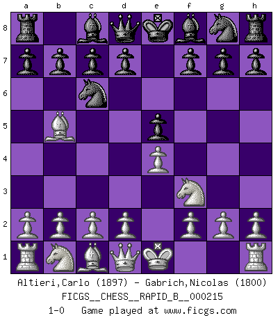 Last move : 1-0 2014 April 3 7:9:42 [Event "FICGS__CHESS__RAPID_B__000215"] [Site "FICGS"] [Date "2014.02.28"] [Round "1"] [White "Altieri,Carlo"] [Black "Gabrich,Nicolas"] [Result "1-0"] [WhiteElo "1897"] [BlackElo "1800"] 1.e4 e5 2.Nf3 Nc6 3.Bb5 1-0 This chess game has been lost on time (started : 2014.02.28 16:48:55) Ruy Lopez (Spanish Opening) Player White won this chess game. Follow this game move after move (download)Only sissies Castle. (Rob Sillars) Schach ist ein Kampf gegen den Fehler. (Johannes Herrman Zukertort) La partida mas dura de ganar es una partida ganada. (Emanuel Lasker) Il n'y a plus de joueurs du niveau de Jacob Murray dont la seule quête est le beau jeu, le plaisir de voir les pièces construire quelque chose. Sur 10 idées à la minute, 9 seront sans intérêt, la dernière s'avèrera géniale. (Christian Bauer) No enterprise is more likely to succeed than one concealed from the enemy until it is ripe for execution. (Niccolo Machiavelli)