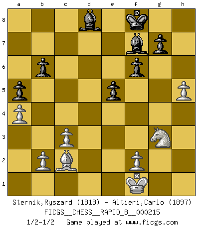 Last move : 1/2-1/2 2014 April 22 22:54:52 [Event "FICGS__CHESS__RAPID_B__000215"] [Site "FICGS"] [Date "2014.02.28"] [Round "1"] [White "Sternik,Ryszard"] [Black "Altieri,Carlo"] [Result "1/2-1/2"] [WhiteElo "1818"] [BlackElo "1897"] 1.e4 e5 2.Nf3 Nc6 3.Bc4 Bc5 4.O-O d6 5.c3 Nf6 6.d4 Bb6 7.dxe5 Nxe5 8.Nxe5 dxe5 9.Qxd8+ Kxd8 10.Nd2 Ke7 11.a4 a5 12.Bd3 Rd8 13.Bc2 Be6 14.Nf3 Nd7 15.Rd1 Nc5 16.Be3 f6 17.h3 Kf7 18.Rd2 Rxd2 19.Nxd2 Rd8 20.Rd1 Rd6 21.Bxc5 Bxc5 22.Nb3 Bb6 23.Rxd6 cxd6 24.g4 h5 25.gxh5 Bxh3 26.Nd2 Be6 27.Kf1 Ke7 28.Bd3 d5 29.exd5 Bxd5 30.Nc4 Bd8 31.Ne3 Bb3 32.Be4 b6 33.Bc2 Bf7 34.Nf5+ Kf8 35.Ng3 1/2-1/2 Giuoco Piano Kingside Castling by player White (move 4) This chess game ended in a draw. Follow this game move after move (download)Chess teaches you to control the initial excitement you feel when you see something that looks good and it trains you to think objectively when you're in trouble. (Stanley Kubrick) Ohne ihre Erfolge schmälern zu wollen würde ich sagen Petrosian, Spassky und Karpov verdanken ihre Siege ihren Trainern - Boleslavsky, Bondarevsky und Furman. (Mikhail Moiseyevich Botvinik) Desconfianza es la característica mas necesaria de un jugador de Ajedrez. (Siegbert Tarrasch) La menace est plus forte que l'exécution. (Aaron Nimzovitch) There is a computer disease that anybody who works with computers knows about. It's a very serious disease and it interferes completely with the work. The trouble with computers is that you 'play' with them ! (Richard P. Feynman)