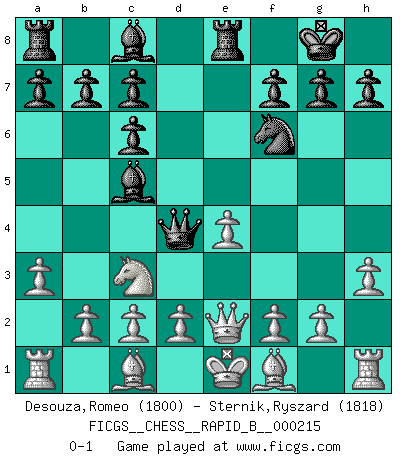 Last move : 0-1 2014 April 17 19:53:21 [Event "FICGS__CHESS__RAPID_B__000215"] [Site "FICGS"] [Date "2014.02.28"] [Round "1"] [White "Desouza,Romeo"] [Black "Sternik,Ryszard"] [Result "0-1"] [WhiteElo "1800"] [BlackElo "1818"] 1.e4 e5 2.Nf3 Nc6 3.a3 Nf6 4.Nc3 Bc5 5.Nxe5 O-O 6.Nxc6 dxc6 7.h3 Qd4 8.Qe2 Re8 0-1 This chess game has been lost on time (started : 2014.02.28 16:48:55) King's pawn game Kingside Castling by player Black (move 5) Player Black won this chess game. Follow this game move after move (download)The passed Pawn is a criminal, who should be kept under lock and key. Mild measures, such as police surveillance, are not sufficient. (Aaron Nimzovich) Ein Isolani verdüstert die Stimmung auf dem ganzen Schachbrett. (Savielly Grigorievitsch Tartakower) Yo creo que el Ajedrez posee una magia que es también una ayuda en la edad avanzada. Una rodilla reumática es olvidada durante una partida de Ajedrez y otros eventos pueden parecer algo sin importancia comparada a una catástrofe en el tablero de Ajedrez. (Vlastimil Hort) Il vaut mieux sacrifier les pièces de l'adversaire. (Xavier Tartacover) A government big enough to give you everything you want is strong enough to take everything you have. (Thomas Jefferson)
