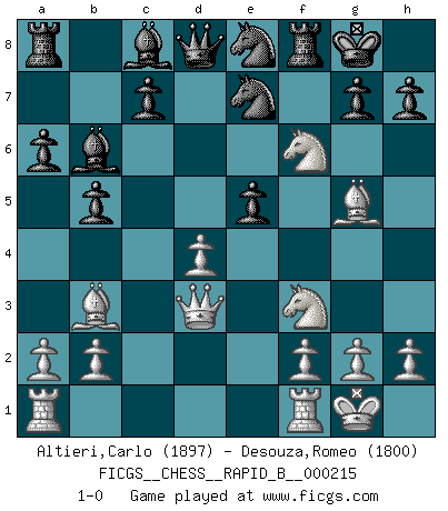 Last move : 1-0 2014 April 23 20:18:35 [Event "FICGS__CHESS__RAPID_B__000215"] [Site "FICGS"] [Date "2014.02.28"] [Round "1"] [White "Altieri,Carlo"] [Black "Desouza,Romeo"] [Result "1-0"] [WhiteElo "1897"] [BlackElo "1800"] 1.e4 e5 2.Nf3 Nc6 3.Bb5 a6 4.Ba4 b5 5.Bb3 Nf6 6.O-O Bc5 7.c3 O-O 8.d4 exd4 9.cxd4 Bb6 10.e5 Ne8 11.Bg5 Ne7 12.Qd3 d6 13.Nc3 dxe5 14.Nd5 f6 15.Nxf6+ 1-0 This chess game has been lost on time (started : 2014.02.28 16:48:55) Ruy Lopez : Caro variation Kingside Castling by player White (move 6) Kingside Castling by player Black (move 7) Player White won this chess game. Follow this game move after move (download)Life is like a game of Chess, changing with each move. (Chinese proverb) Wenn ich Weiß habe gewinne ich weil ich Weiß habe, wenn ich Schwarz habe gewinne ich weil ich Bogoljubov bin. (Efim Bogoljubov) Fischer es el jugador mas fuerte del mundo. De hecho, el jugador mas fuerte que jamas haya existido. (Larry Evans) Même si vous avez un bon coup à faire, regardez toujours s'il n'y en a pas un qui lui soit préférable. (Pedro Damiano) My poor ole parrot... Is not in the circulation of displays ....poo hoo hoo :) (Wayne Lowrance's enigma)