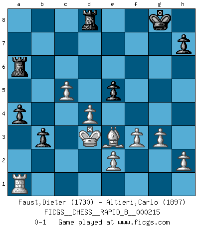 Last move : 0-1 2014 April 26 15:24:35 [Event "FICGS__CHESS__RAPID_B__000215"] [Site "FICGS"] [Date "2014.02.28"] [Round "1"] [White "Faust,Dieter"] [Black "Altieri,Carlo"] [Result "0-1"] [WhiteElo "1730"] [BlackElo "1897"] 1.d4 d5 2.c4 c6 3.Nf3 e6 4.g3 Nf6 5.Bg2 Bb4+ 6.Bd2 Be7 7.O-O O-O 8.Qb3 Nbd7 9.Nc3 Nb6 10.cxd5 exd5 11.Rfe1 Ne4 12.Bf4 g5 13.Bc1 Be6 14.Ne5 Re8 15.a4 a5 16.Qc2 Nd6 17.b3 Bf5 18.Qd2 Ne4 19.Nxe4 dxe4 20.Nc4 Nxc4 21.bxc4 Bb4 22.Qxg5+ Qxg5 23.Bxg5 Bxe1 24.Rxe1 Be6 25.Rc1 Ra6 26.f3 e3 27.c5 Bb3 28.Ra1 b5 29.axb5 cxb5 30.Bh3 Be6 31.Bxe6 fxe6 32.Bxe3 Rd8 33.Kf1 a4 34.Ke1 b4 35.Kd2 e5 36.Kd3 b3 0-1 QGD Slav : 3.Nf3 Kingside Castling by player White (move 7) Kingside Castling by player Black (move 7) Player Black won this chess game. Follow this game move after move (download)We must make sure that Chess will not be like a dead language, very interesting, but for a very small group. (Sytze Faber) Im Wettkampf zwischen starken Meistern kommen Fehler sehr selten vor, deshalb ist es mit bloßem Warten nicht getan. (José Raúl Capablanca) En un gambito tu regalas un Peón por el bién de tomar un juego perdido. (Samuel Standige Boden) Le plus grand jeu de l'esprit jamais inventé, plus vous l'apprenez, plus vous y prenez du plaisir. (Garry Kasparov) At last I discovered the true beauty of chess. So I proposed to her. (Dinesh De Silva)