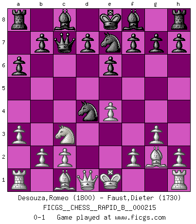 Last move : 0-1 2014 April 19 20:8:33 [Event "FICGS__CHESS__RAPID_B__000215"] [Site "FICGS"] [Date "2014.02.28"] [Round "1"] [White "Desouza,Romeo"] [Black "Faust,Dieter"] [Result "0-1"] [WhiteElo "1800"] [BlackElo "1730"] 1.e4 c5 2.Nf3 e6 3.Nc3 a6 4.d4 cxd4 5.Nxd4 Qc7 6.a3 Nc6 7.g3 Nge7 8.Bg2 Nxd4 0-1 This chess game has been lost on time (started : 2014.02.28 16:48:55) Sicilian defense Player Black won this chess game. Follow this game move after move (download)Some sacrifices are sound; the rest are mine. (Mikhail Tal) Ein Kibitz ist einer, der deinem Gegner gute Ratschläge gibt. (Andrew Soltis) Un buen jugador siempre tiene buena suerte. (José Raúl Capablanca) Les ravages du H expliquent la différence de niveau entre Tal et Thal [Abergel]. He is a liar. I just don't know what the lie is yet. (Horatio Caine, C.S.I. Miami)