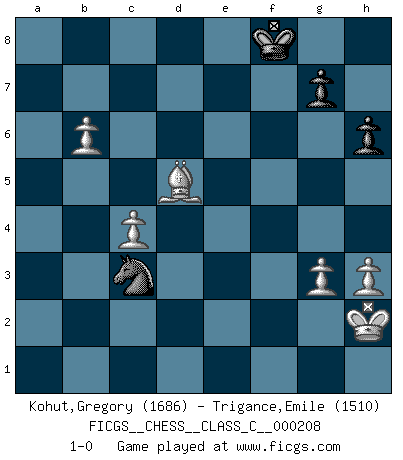 Last move : 1-0 2014 October 8 7:8:51 [Event "FICGS__CHESS__CLASS_C__000208"] [Site "FICGS"] [Date "2014.03.01"] [Round "1"] [White "Kohut,Gregory"] [Black "Trigance,Emile"] [Result "1-0"] [WhiteElo "1686"] [BlackElo "1510"] 1.e4 e6 2.d4 d5 3.Nc3 dxe4 4.Nxe4 Nd7 5.Nf3 Ngf6 6.Bd3 Be7 7.Qe2 Nxe4 8.Qxe4 Nf6 9.Qe2 c5 10.dxc5 Bxc5 11.O-O O-O 12.Rd1 Qb6 13.b3 Rd8 14.Bg5 Be7 15.c4 Bd7 16.Ne5 Be8 17.h3 h6 18.Bd2 Bc5 19.Bc3 Bd4 20.Qb2 Bxc3 21.Qxc3 Bc6 22.Nxc6 Qxc6 23.Rd2 Rd7 24.Rad1 Rad8 25.Qb2 Nh5 26.Be2 Nf4 27.Bf3 Qc7 28.Rxd7 Rxd7 29.Rxd7 Qxd7 30.Qe5 Qd2 31.Qb8+ Kh7 32.Qxa7 Qe1+ 33.Kh2 Qe5 34.Qxb7 Nd3 35.g3 Nxf2 36.Qxf7 Qb2 37.Bg2 Qxa2 38.Qxe6 Qc2 39.b4 Nd1 40.Qe4+ Qxe4 41.Bxe4+ Kg8 42.b5 Nc3 43.Bd5+ Kf8 44.b6 1-0 French : Rubinstein variation Kingside Castling by player White (move 11) Kingside Castling by player Black (move 11) 10 pieces endgame at move 41 : White KBPPPP , Black KNPP WHITE : King + 1 Bishop 4 Pawns BLACK : King + 1 Knight 2 Pawns Player White won this chess game. Follow this game move after move (download)If Chess is a science, it's a most inexact one. If Chess is an art, it is too exacting to be seen as one. If Chess is a sport, it's too esoteric. If Chess is a game, it's too demanding to be just a game. If Chess is a mistress, she's a demanding one. If Chess is a passion, it's a rewarding one. If Chess is life, it's a sad one. (Unknown) Versuche, dich von der Sklaverei der Eröffnungsvarianten zu befreien. Stattdessen soll man gewisse Typenpositionen erlernen, die man eingehend analysiert. (Aaron Nimzowitsch) Yo jugué Ajedrez con el y a veces le pude haber ganado solo que siempre devuelve su última jugada y juega la partida de manera diferente. (Mark Twain) Les réformistes prétendent que les progrès de la théorie conduiront à la disparition des échecs, et qu'il faut, pour leur rendre vie, en remanier les règles. En réalité, qu'exprime cette affirmation? Le mépris de l'intuition, de l'imagination et de tous les autres éléments qui font des échecs un art. (Alexander Alekhine) There is a great deal of difference between an eager man who wants to read a book and a tired man who wants a book to read. (G.K. Chesterton)