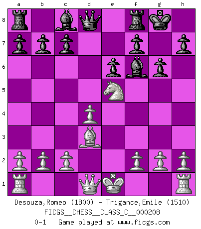 Last move : 0-1 2014 May 5 16:27:1 [Event "FICGS__CHESS__CLASS_C__000208"] [Site "FICGS"] [Date "2014.03.01"] [Round "1"] [White "Desouza,Romeo"] [Black "Trigance,Emile"] [Result "0-1"] [WhiteElo "1800"] [BlackElo "1510"] 1.e4 e6 2.Nf3 d5 3.Nc3 dxe4 4.Nxe4 Nd7 5.d4 Ngf6 6.Nxf6+ Nxf6 7.Bg5 Be7 8.Ne5 O-O 9.Bxf6 Bxf6 10.Bd3 g6 0-1 French defense Kingside Castling by player Black (move 8) Player Black won this chess game. Follow this game move after move (download)The passion for playing Chess is one of the most unaccountable in the world. (H.G. Wells) Dieses schreckliche Gefühl, dass ich gegen eine Maschine spielte, die niemals Fehler macht, zerschmetterte meinen Widerstand. (Mark Taimanov) El Ajedrez es un juego terrible. Si no dominas el centro, tu oponente tiene una posición mas libre. Si tu tienes el centro, entonces realmente tienes algo de que preocuparte. (Siegbert Tarrasch) Votre seul travail dans les ouvertures est d'obtenir un milieu de partie jouable. (Lajos Portish) However beautiful the strategy, you should occasionally look at the results. (Winston Churchill)