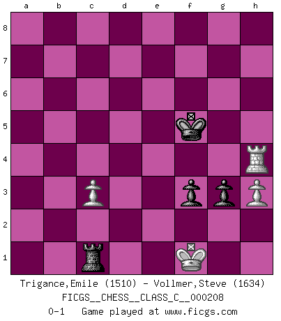 Last move : 0-1 2014 March 27 13:41:25 [Event "FICGS__CHESS__CLASS_C__000208"] [Site "FICGS"] [Date "2014.03.01"] [Round "1"] [White "Trigance,Emile"] [Black "Vollmer,Steve"] [Result "0-1"] [WhiteElo "1510"] [BlackElo "1634"] 1.e4 e5 2.d4 exd4 3.c3 dxc3 4.Bc4 Nf6 5.Nxc3 Nc6 6.Nf3 Bb4 7.e5 Qe7 8.O-O Bxc3 9.bxc3 Ne4 10.Qc2 Nc5 11.Bg5 Qf8 12.Rfe1 Ne6 13.a4 Qc5 14.Bxe6 dxe6 15.Be3 Qc4 16.Rab1 a6 17.h3 b5 18.axb5 axb5 19.Nd2 Qa4 20.Qb2 Rb8 21.Bc5 Qa6 22.Ra1 Qb7 23.Rab1 Na5 24.Qb4 Nc6 25.Qg4 Ne7 26.Qg5 Ng6 27.Rbd1 h6 28.Qg3 Qc6 29.Ne4 Bb7 30.Rd4 Rd8 31.Red1 Rxd4 32.Rxd4 Bc8 33.Qd3 Bd7 34.Bb4 Nxe5 35.Qg3 Ng6 36.Nc5 Bc8 37.f3 e5 38.Qe1 f5 39.Rd2 Kf7 40.Qd1 Re8 41.Nd7 e4 42.fxe4 Qxe4 43.Rd4 Qe1+ 44.Qxe1 Rxe1+ 45.Kf2 Re8 46.Nc5 Ne5 47.Ba5 c6 48.Bc7 g5 49.Rd6 h5 50.Rh6 h4 51.Bxe5 Rxe5 52.Rxc6 Be6 53.Nxe6 Rxe6 54.Rc5 Kf6 55.Rxb5 Rc6 56.Rb3 Rc5 57.Ke3 Ke5 58.Ra3 g4 59.Rb3 f4+ 60.Kd3 g3 61.Rb7 Rd5+ 62.Ke2 Kf5 63.Rf7+ Kg5 64.Rf8 Re5+ 65.Kd2 Ra5 66.Ke2 Ra2+ 67.Kf1 Ra1+ 68.Ke2 Rg1 69.Kf3 Rf1+ 70.Ke2 Rf2+ 71.Ke1 Rxg2 72.Kf1 Rc2 73.Rg8+ Kf5 74.Rg4 f3 75.Rxh4 Rc1+ 0-1 Danish gambit Kingside Castling by player White (move 8) 10 pieces endgame at move 55 : White KRPPP , Black KRPPP WHITE : King + 1 Rook 3 Pawns BLACK : King + 1 Rook 3 Pawns 9 pieces endgame at move 71 : White KRPP , Black KRPPP WHITE : King + 1 Rook 2 Pawns BLACK : King + 1 Rook 3 Pawns 8 pieces endgame at move 75 : White KRPP , Black KRPP WHITE : King + 1 Rook 2 Pawns BLACK : King + 1 Rook 2 Pawns Player Black won this chess game. Follow this game move after move (download)It is the aim of the modern school, not to treat every position according to one general law, but according to the principle inherent in the position. (Richard Reti) Alles was ich jemals tun will ist Schach spielen. (Robert James Fischer) Los tropiezos estan todos ahí en el tablero, esperando que se cometan. (Savielly Tartakover) Des idées, des idées, j'en ai cent, j'en ai mille. Des bonnes, des mauvaises, applicables, irréalisables... Il suffit de faire le tri ! (Roos) Now the reason the enlightened prince and the wise general conquer the enemy whenever they move and their achievements surpass those of ordinary men is foreknowledge. (Sun Tzu)