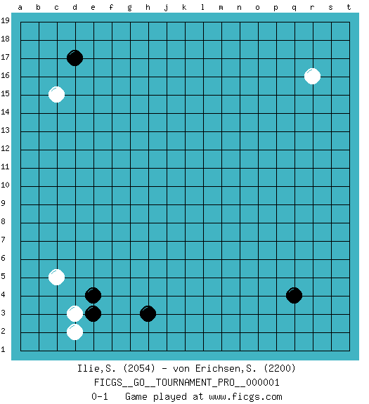 Last move : 0-1 2007 March 21 1:37:17 [Event "FICGS__GO__TOURNAMENT_PRO__000001 "] [Site "FICGS"] [Date "2007.02.13"] [Round "1"] [Black "Ilie,Sebastian "] [White "von Erichsen,Svante Carl "] [Result "0-1"] [Rating 1 "2054"] [Rating 2 "2200"] 1.q4 r16 2.d17 c5 3.e4 d3 4.e3 d2 5.h3 c15 0-1 This go game has been lost on time (started : 2007.02.13 12:57:1) Here are the names of the openings (joseki) played in the four corners : Corner d4 : c5 e4Mokuhazushi (Waemok, Wai`mu`) 5-3 Point. The mokuhazushi (5-3) point was popular in the Edo period in Japan (1600 - 1867). It emphasizes influence; territorially, it is inferior to the 3-4 point.Takamoku Kakari. Black prevents White from gaining influence, but in the local context, abandoning profit in the corner entails a loss. White 3-4 and 4-4 are best. Corner d16 : d17 c15Komoku (Somok, Xiao~mu`) 3-4 Point. The komoku (3-4) point is the traditional corner enclosure move..Ikken Kakari (Hankan Keolch'im, Yi Gua`jiao~, 1-Space Low Pincer). The small knight move is the basic approach move to the 3-4 point stone. It has been continually used for over four centuries. There are limitless variations, with new moves constantly being discovered. White 2 opens the door to a treaure store of joseki. Player White won this Go (weiqi, baduk) game.Follow this game move after move (download ) Learn the eye-stealing tesuji. (Anonymous) I think your argument is specious - I think your tie is ugly. (Gregory House to Dr. Foreman, House M.D.)