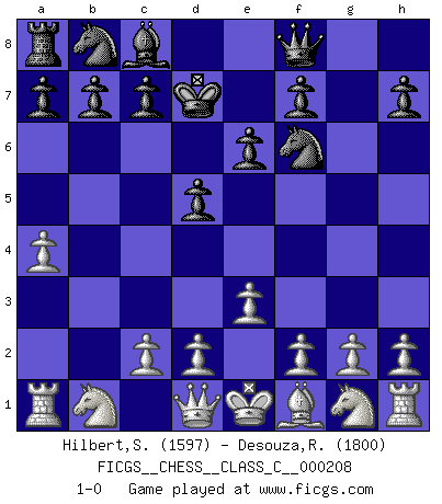 Last move : 1-0 2014 April 23 20:18:35 [Event "FICGS__CHESS__CLASS_C__000208"] [Site "FICGS"] [Date "2014.03.01"] [Round "1"] [White "Hilbert,Stephan J."] [Black "Desouza,Romeo"] [Result "1-0"] [WhiteElo "1597"] [BlackElo "1800"] 1.b4 d5 2.Bb2 e6 3.e3 Bxb4 4.Bxg7 Nf6 5.Bxh8 Kd7 6.Bg7 Bf8 7.Bxf8 Qxf8 8.a4 1-0 This chess game has been lost on time (started : 2014.03.01 13:3:19) Polish (Sokolsky) opening Player White won this chess game. Follow this game move after move (download)We cannot resist the fascination of sacrifice, since a passion for sacrifices is part of a Chessplayer's nature. (Rudolf Spielman) Wenn du auf das Glück wartest, wird das Leben ziemlich langweilig. (Mikhail Nekhemyevich Tal) Mi estilo es algo parecido entre un poco de Tal y Petrosian. (Reshevsky) À la honte des hommes, on sait que les lois du jeu sont les seules qui soient partout justes, claires, inviolables et exécutées. Pourquoi l'Indien qui a donné les règles du jeu d'échecs est-il obéi de bon gré dans toute la terre, et que les décrétales des papes, par exemple, sont aujourd'hui un objet d'horreur et de mépris ? C'est que l'inventeur des échecs combina tout avec justesse pour la satisfaction des joueurs, et que les papes, dans leurs décrétales, n'eurent en vue que leur seul avantage. L'Indien voulut exercer également l'esprit des hommes et leur donner du plaisir; les papes ont voulu abrutir l'esprit des hommes. Voltaire (Dictionnaire philosophique / Garnier 1967) You think that education is too expensive ? Try ignorance. (Derek Bok)