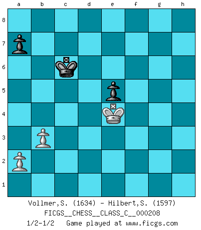 Last move : 1/2-1/2 2014 March 18 12:8:29 [Event "FICGS__CHESS__CLASS_C__000208"] [Site "FICGS"] [Date "2014.03.01"] [Round "1"] [White "Vollmer,Steve"] [Black "Hilbert,Stephan J."] [Result "1/2-1/2"] [WhiteElo "1634"] [BlackElo "1597"] 1.e4 d5 2.exd5 Qxd5 3.Nf3 Nf6 4.c4 Qd8 5.Nc3 Bg4 6.Be2 e6 7.O-O c6 8.d4 Nbd7 9.Be3 h6 10.Ne5 Bxe2 11.Qxe2 Bd6 12.Rad1 Qc7 13.f4 O-O 14.Bc1 Rad8 15.Ne4 Nxe4 16.Qxe4 Nf6 17.Qe2 Nd7 18.Rfe1 Nf6 19.Qf3 Bb4 20.Rf1 Qb6 21.Be3 Be7 22.b3 Qc7 23.g4 Nh7 24.h4 g5 25.hxg5 hxg5 26.f5 Bd6 27.Nd3 Bg3 28.f6 Bh4 29.Kg2 c5 30.dxc5 Qc6 31.Qxc6 bxc6 32.Kh3 Rd7 33.Ne5 Rxd1 34.Rxd1 Nxf6 35.Nxc6 Ne4 36.Ne7+ Kg7 37.c6 Bg3 38.Bxg5 f6 39.Rd7 Rf7 40.c7 Bxc7 41.Rxc7 Nxg5+ 42.Kg2 f5 43.gxf5 e5 44.Nd5 Rxc7 45.Nxc7 Kf6 46.c5 Kxf5 47.c6 Ne6 48.Nxe6 Kxe6 49.Kf3 Kd6 50.Ke4 Kxc6 1/2-1/2 Scandinavian (centre counter) defense Kingside Castling by player White (move 7) Kingside Castling by player Black (move 13) 10 pieces endgame at move 45 : White KNPPPP , Black KNPP WHITE : King + 1 Knight 4 Pawns BLACK : King + 1 Knight 2 Pawns 9 pieces endgame at move 46 : White KNPPP , Black KNPP WHITE : King + 1 Knight 3 Pawns BLACK : King + 1 Knight 2 Pawns 8 pieces endgame at move 48 : White KNPPP , Black KPP WHITE : King + 1 Knight 3 Pawns BLACK : King + 2 Pawns 7 pieces endgame at move 48 : White KPPP , Black KPP WHITE : King + 3 Pawns BLACK : King + 2 Pawns 6 pieces endgame at move 50 : White KPP , Black KPP WHITE : King + 2 Pawns BLACK : King + 2 Pawns This chess game ended in a draw. Follow this game move after move (download)It is no time to be playing Chess when the house is on fire. (Italian Proverb) Taktik ist was man tun muß, wenn etwas zu tun ist. Strategie ist was man tun muß, wenn nichts zu tun ist. (Savielly Grigorievitsch Tartakower) El ganador de una partida es aquel jugador que hace el penúltimo error. (Savielly Tartakover) Le génie consiste à savoir transgresser les règles au moment opportun. (Teichmann) Fame, I have already. Now I need the money. (an elderly Steinitz)