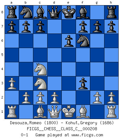 Last move : 0-1 2014 April 20 20:10:20 [Event "FICGS__CHESS__CLASS_C__000208"] [Site "FICGS"] [Date "2014.03.01"] [Round "1"] [White "Desouza,Romeo"] [Black "Kohut,Gregory"] [Result "0-1"] [WhiteElo "1800"] [BlackElo "1686"] 1.e4 e6 2.Nf3 d5 3.a3 dxe4 4.Ne5 Qd5 5.Nc4 Nf6 6.Nc3 Qd8 7.f3 exf3 0-1 This chess game has been lost on time (started : 2014.03.01 13:3:19) French defense Player Black won this chess game. Follow this game move after move (download)I am still a victim of Chess. It has all the beauty of art and much more. It cannot be commercialized. Chess is much purer than art in its social position. (Marcel Duchamp) Auf jeden Fall musst du zuerst Rechtsanwalt werden, damit du deine eigenen Interessen und die deiner Familie vertreten kannst. [Brief an seinen Sohn] (José Raúl Capablanca) Fischer es el jugador mas fuerte del mundo. De hecho, el jugador mas fuerte que jamas haya existido. (Larry Evans) Un millionnaire : 'Monsieur Steinitz ! Vous ne participez aux tournois que pour l'argent, alors que moi je n'y viens que pour l'honneur.' Steinitz : 'Chacun joue pour ce qu'il n'a pas'... Now be brave and don't look back. Don't look back. (Shmi Skywalker in Star Wars ep.1)