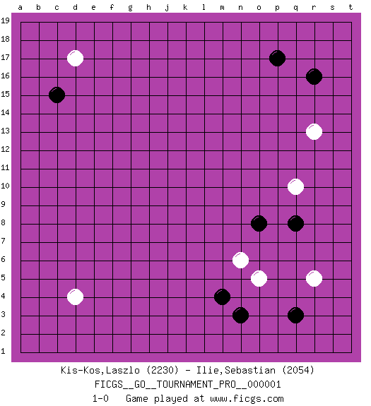 Last move : 1-0 2007 March 24 2:0:13 [Event "FICGS__GO__TOURNAMENT_PRO__000001 "] [Site "FICGS"] [Date "2007.02.13"] [Round "1"] [Black "Kis-Kos,Laszlo "] [White "Ilie,Sebastian "] [Result "1-0"] [Rating 1 "2230"] [Rating 2 "2054"] 1.r16 d17 2.q3 d4 3.p17 r5 4.q8 o5 5.n3 q10 6.o8 r13 7.m4 n6 8.c15 1-0 This go game has been lost on time (started : 2007.02.13 12:57:1) Here are the names of the openings (joseki) played in the four corners : Corner q4 : q3 r5Komoku (Somok, Xiao~mu`) 3-4 Point. The komoku (3-4) point is the traditional corner enclosure move..Ikken Kakari (Hankan Keolch'im, Yi Gua`jiao~, 1-Space Low Pincer). The small knight move is the basic approach move to the 3-4 point stone. It has been continually used for over four centuries. There are limitless variations, with new moves constantly being discovered. White 2 opens the door to a treaure store of joseki. Corner d16 : d17 c15Komoku (Somok, Xiao~mu`) 3-4 Point. The komoku (3-4) point is the traditional corner enclosure move..Ikken Kakari (Hankan Keolch'im, Yi Gua`jiao~, 1-Space Low Pincer). The small knight move is the basic approach move to the 3-4 point stone. It has been continually used for over four centuries. There are limitless variations, with new moves constantly being discovered. Black 2 opens the door to a treaure store of joseki. Player Black won this Go (weiqi, baduk) game.Follow this game move after move (download ) Don't count territory held by only one eye. (Anonymous) Fortune favours the audacious. (Desiderius Erasmus)