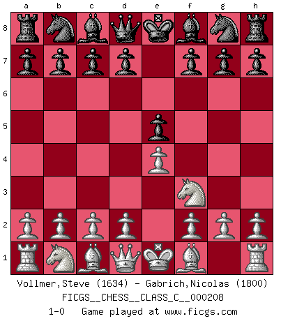 Last move : 1-0 2014 April 10 19:42:5 [Event "FICGS__CHESS__CLASS_C__000208"] [Site "FICGS"] [Date "2014.03.01"] [Round "1"] [White "Vollmer,Steve"] [Black "Gabrich,Nicolas"] [Result "1-0"] [WhiteElo "1634"] [BlackElo "1800"] 1.e4 e5 2.Nf3 1-0 This chess game has been lost on time (started : 2014.03.01 13:3:19) King's knight Opening Player White won this chess game. Follow this game move after move (download)For surely of all the drugs in the world, Chess must be the most permanently pleasurable. (Assiac) Die westlichen Werte sind eine Sprache, welche die Putin-Administration nicht versteht. (Garry Kasparov) Sin errores no puede haber brillantez. (Emanuel Lasker) Mais n'est-ce pas déjà le limiter injurieusement que d'appeler les échecs un jeu? N'est-ce pas aussi une science, un art, ou quelque chose qui, comme le cercueil de Mahomet entre ciel et terre, est suspendu entre l'un et l'autre, et qui réunit un nombre incroyable de contraires ? (Stefan Zweig) Computer Science is no more about computers than astronomy is about telescopes. (Edsger W. Dijkstra)