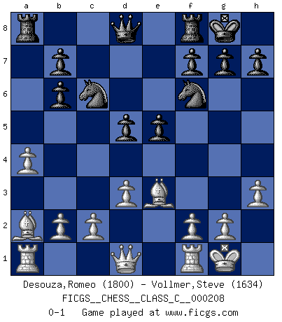 Last move : 0-1 2014 May 5 16:27:23 [Event "FICGS__CHESS__CLASS_C__000208"] [Site "FICGS"] [Date "2014.03.01"] [Round "1"] [White "Desouza,Romeo"] [Black "Vollmer,Steve"] [Result "0-1"] [WhiteElo "1800"] [BlackElo "1634"] 1.e4 e5 2.Nf3 Nc6 3.Nc3 Nf6 4.Bc4 Bc5 5.O-O O-O 6.d3 d6 7.Be3 Bg4 8.h3 Bxf3 9.Qxf3 Nd4 10.Qd1 c6 11.Na4 Bb6 12.Nxb6 axb6 13.a4 d5 14.exd5 cxd5 15.Ba2 Nc6 0-1 Four knights : Italian variation Kingside Castling by player White (move 5) Kingside Castling by player Black (move 5) Player Black won this chess game. Follow this game move after move (download)Chess is like war on a board. (Bobby Fischer) Das Blackmar-Diemer-Gambit verändert den ganzen Menschen! (Emil Joseph Diemer) Evita las multitudes. Haz independientemente tu propio razonamiento. Trata de ser el jugador de Ajedrez, no la pieza de Ajedrez. (Ralph Charell) Demandez au pauvre Cg1 ce qu'il en pense. Eduard Gufeld à propos de la variante Saemisch de l'Est-Indienne. I don't believe in psychology. I believe in good moves. (Bobby Fischer)