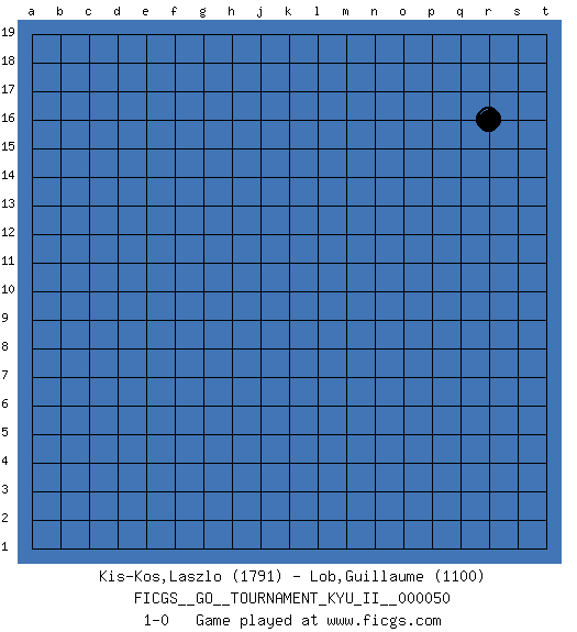 Last move : 1-0 2014 April 1 19:7:52 [Event "FICGS__GO__TOURNAMENT_KYU_II__000050"] [Site "FICGS"] [Date "2014.03.02"] [Round "1"] [Black "Kis-Kos,Laszlo"] [White "Lob,Guillaume"] [Result "1-0"] [Rating 1 "1791"] [Rating 2 "1100"] 1.r16 1-0 This go game has been lost on time (started : 2014.03.02 5:18:45) Here are the names of the openings (joseki) played in the four corners : Player Black won this Go (weiqi, baduk) game. Follow this game move after move (download)The simplest move is the best move. (Anonymous) It is a good thing for an uneducated man to read books of quotations. (Winston Churchill)