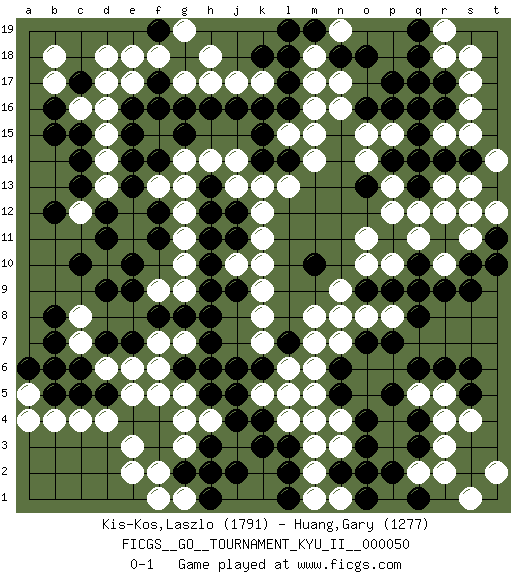 Last move : 0-1 2014 August 13 3:24:33 [Event "FICGS__GO__TOURNAMENT_KYU_II__000050"] [Site "FICGS"] [Date "2014.03.02"] [Round "1"] [Black "Kis-Kos,Laszlo"] [White "Huang,Gary"] [Result "0-1"] [Rating 1 "1791"] [Rating 2 "1277"] 1.r16 d16 2.q3 d4 3.p17 r10 4.r6 r13 5.f3 j3 6.c6 d6 7.d7 e6 8.c5 c4 9.c10 c12 10.d5 e5 11.e4 e3 12.f4 b4 13.e7 f6 14.b5 c7 15.b7 c8 16.b8 a5 17.b6 e2 18.d9 h6 19.l3 l4 20.m4 m3 21.k4 l5 22.k3 n4 23.j4 h4 24.h3 g3 25.j2 g4 26.g2 f2 27.f17 e17 28.f16 d14 29.k16 m16 30.c17 d18 31.c15 d15 32.c14 c16 33.b16 b17 34.b15 b18 35.c13 d13 36.b12 h17 37.h16 j17 38.j16 k17 39.q9 m5 40.q10 q11 41.p11 q12 42.j6 r4 43.q4 r5 44.q6 q5 45.p5 r3 46.o4 q2 47.p2 r2 48.o3 m8 49.s5 s4 50.s6 t2 51.l17 m17 52.l18 f18 53.g18 g17 54.f19 e18 55.g16 h18 56.l16 q16 57.q17 m14 58.m10 k8 59.h7 p10 60.r9 o11 61.p9 o10 62.o9 n9 63.h12 k11 64.h10 j13 65.h13 j10 66.j9 k9 67.j11 k10 68.d12 e12 69.d11 r15 70.p16 s16 71.q15 s17 72.r14 s15 73.q13 p13 74.q14 s13 75.s14 t14 76.o7 g7 77.h8 j14 78.l7 m7 79.n6 m6 80.r11 r12 81.s10 o15 82.n18 m18 83.m19 n17 84.o18 g1 85.h2 m2 86.h5 f5 87.g8 f7 88.f8 e11 89.e10 r18 90.q18 n7 91.e13 f13 92.e14 h14 93.f14 g14 94.e16 g11 95.h11 g13 96.f12 g12 97.f11 g10 98.r17 r19 99.q19 s18 100.k18 g19 101.l14 l13 102.k14 k13 103.n5 o8 104.p7 g9 105.h9 k7 106.p14 o14 107.g6 g5 108.h6 p15 109.q16 s11 110.t11 r10 111.e15 d17 112.r11 n19 113.l19 r10 114.o13 p12 115.r11 s12 116.o16 l15 117.k15 m15 118.k6 l6 119.a6 a4 120.l2 f9 121.e9 t12 122.t10 k5 123.j5 n16 124.j12 k12 125.n2 m1 126.q1 s1 127.g15 n1 128.o1 n3 129.o2 r10 130.s9 p8 131.q8 n8 132.h1 f1 133.l1 m4 0-1 Here are the names of the openings (joseki) played in the four corners : Corner d4 : d4 f3 Hoshi (Hwajeom, Seongjeom, Xingwei`) 4-4 Point. The star or hoshi (4-4) point, emphasizing influence at the potential expense of territory. Ikken Kakari (Hankan Keolch'im, Yi Gua`jiao~, 1-Space Low Approach). Black 2 is the standard approach move to the 4-4. Player White won this Go (weiqi, baduk) game. Follow this game move after move (download)Pon-nuki is worth thirty points. (Anonymous) The question of whether computers can think is just like question of whether submarines can swim. (Edsger W. Dijkstra)