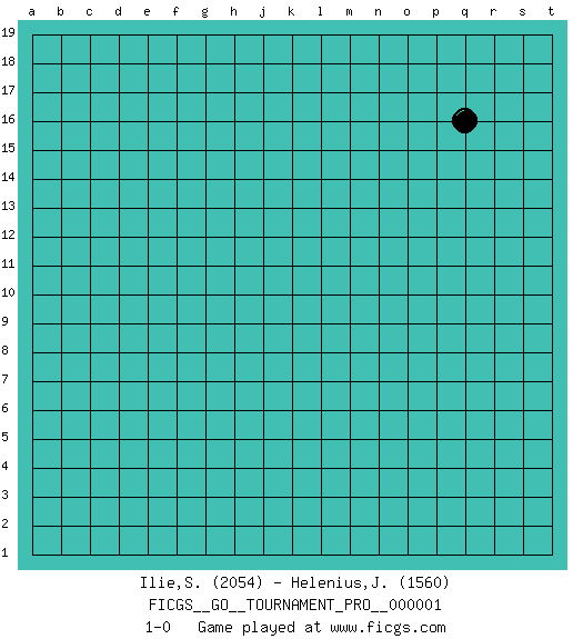 Last move : 1-0 2007 March 22 13:49:6 [Event "FICGS__GO__TOURNAMENT_PRO__000001"] [Site "FICGS"] [Date "2007.02.13"] [Round "1"] [Black "Ilie,Sebastian"] [White "Helenius,Jan-Krister"] [Result "1-0"] [Rating 1 "2054"] [Rating 2 "1560"] 1.q16 1-0 This go game has been lost on time (started : 2007.02.13 12:57:1) Here are the names of the openings (joseki) played in the four corners : Player Black won this Go (weiqi, baduk) game. Follow this game move after move (download)Corner, side, centre. (Anonymous) Go and wake up your luck. (Persian saying)