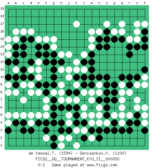 Last move : 0-1 2014 September 22 21:51:14 [Event "FICGS__GO__TOURNAMENT_KYU_II__000050"] [Site "FICGS"] [Date "2014.03.02"] [Round "1"] [Black "de Vassal,Thibault"] [White "Denisenkov,Valentin"] [Result "0-1"] [Rating 1 "1594"] [Rating 2 "1100"] 1.c3 q17 2.r3 d16 3.k4 r15 4.r10 k17 5.c10 e10 6.d12 d4 7.c4 d5 8.d3 c5 9.e4 e5 10.f4 f5 11.g5 d8 12.c15 c16 13.d15 e15 14.e14 f15 15.f14 g15 16.o10 q4 17.r4 q5 18.q3 n4 19.p3 r8 20.r6 q6 21.r13 r5 22.s5 s6 23.r7 s7 24.s4 q7 25.o14 n16 26.o5 n5 27.o6 n6 28.o7 m14 29.l10 l6 30.j6 m8 31.n7 m7 32.k8 k7 33.j8 o4 34.p4 p5 35.o9 l3 36.l4 k3 37.j3 m4 38.n2 m2 39.n3 l5 40.m3 j4 41.k5 j5 42.k6 j7 43.h6 h7 44.g7 h8 45.g9 h9 46.g10 g8 47.f8 f7 48.g6 f6 49.h4 k9 50.k10 j10 51.e9 d9 52.d10 e8 53.f9 e11 54.g11 c7 55.m13 j2 56.h3 h2 57.g2 s9 58.s10 j11 59.s14 l13 60.m12 j13 61.g13 b15 62.b14 b16 63.b13 n8 64.o8 b5 65.b4 b11 66.b10 d11 67.c11 c12 68.c13 e12 69.f12 d13 70.b12 d14 71.c14 g14 72.f13 h13 73.e13 c9 74.b9 b8 75.n14 m15 76.q15 q16 77.p15 s15 78.r14 q9 79.q10 a4 80.a3 a5 81.o16 o17 82.l9 l8 83.l12 k12 84.m9 n9 85.n10 l11 86.m11 k11 87.m10 p16 88.o15 f2 89.g1 g3 90.f3 h1 91.g4 k1 92.l2 a14 93.n15 m16 94.r9 t10 95.t11 t9 96.t15 s16 97.t16 t17 98.t14 s17 99.h12 h11 100.d12 t5 101.p8 q8 102.p9 t4 103.t3 t6 104.m6 m5 105.o3 a9 106.a10 a8 107.g12 a13 108.a12 a15 109.p7 pass 0-1 Here are the names of the openings (joseki) played in the four corners : Corner d16 : d16 d12 Hoshi (Hwajeom, Seongjeom, Xingwei`) 4-4 Point. The star or hoshi (4-4) point, emphasizing influence at the potential expense of territory. Corner d4 : c3 d4 San-San (Sam-Sam, San-San) 3-3 Point. The San-San (3-3) point, emphasizing territory at the expense of influence. Kata-tsuki (shoulder hit). The shoulder-hit is the traditional answer to the 3-3. The direction of Black 3 depends on the positions on the side. Crawling once may be the premise for a follow-up move of sliding with a knight's move in the opposite direction. If Black plays 3 at 3-4 (to the right), the follow-on knight's move is then played at the top (e.g. 3-4, 4-5, 5-2). Black's knight's move reduces territory potential on the side it is played. Corner q4 : r3 q4 San-San (Sam-Sam, San-San) 3-3 Point. The San-San (3-3) point, emphasizing territory at the expense of influence. Kata-tsuki (shoulder hit). The shoulder-hit is the traditional answer to the 3-3. The direction of Black 3 depends on the positions on the side. Crawling once may be the premise for a follow-up move of sliding with a knight's move in the opposite direction. If Black plays 3 at 3-4 (to the right), the follow-on knight's move is then played at the top (e.g. 3-4, 4-5, 5-2). Black's knight's move reduces territory potential on the side it is played. Player White won this Go (weiqi, baduk) game. Follow this game move after move (download)When your opponent is thick, you must also become thick. (Otake Hideo, 9p) You can only get smarter by playing a smarter opponent. (Revolver, movie)