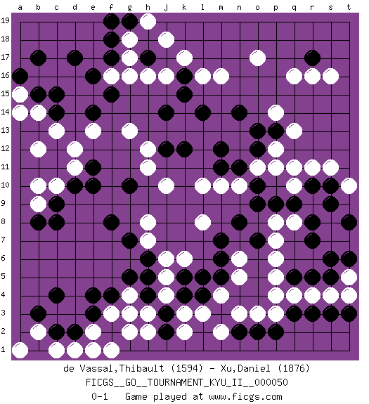 Last move : 0-1 2014 August 13 20:6:19 [Event "FICGS__GO__TOURNAMENT_KYU_II__000050"] [Site "FICGS"] [Date "2014.03.02"] [Round "1"] [Black "de Vassal,Thibault"] [White "Xu,Daniel"] [Result "0-1"] [Rating 1 "1594"] [Rating 2 "1876"] 1.c4 q4 2.d17 q16 3.e3 c10 4.c15 k17 5.h17 c13 6.c8 e13 7.f15 k3 8.f8 g13 9.r3 r4 10.q3 p3 11.p2 o3 12.o2 n3 13.q9 p7 14.r7 s4 15.s3 r11 16.r10 q11 17.o9 o11 18.n8 n6 19.m7 o17 20.m6 n5 21.m5 m4 22.l4 l3 23.k4 j4 24.j3 j5 25.k5 k6 26.l5 h3 27.j2 h2 28.h4 k2 29.h5 j6 30.h6 b9 31.b8 h7 32.g7 h8 33.g3 g2 34.f2 g4 35.f4 f3 36.g5 g3 37.e4 r16 38.n14 m16 39.l14 h16 40.m12 m10 41.o12 p12 42.o13 p14 43.n11 n10 44.o10 p11 45.m11 g17 46.f17 g18 47.f18 f16 48.e16 g16 49.e14 b14 50.b15 l10 51.k12 j10 52.o7 p8 53.p9 p6 54.s9 s11 55.s5 t4 56.t3 t5 57.s6 q8 58.r8 l8 59.s10 q10 60.t8 t10 61.q5 p5 62.r5 e2 63.d2 f1 64.c9 b10 65.d10 d11 66.e10 d1 67.c2 c1 68.b1 e1 69.p13 q13 70.e11 d12 71.j14 h12 72.j12 h11 73.k16 l16 74.k15 j16 75.g19 h19 76.f19 j18 77.g10 a15 78.a16 a14 79.b17 b2 80.b3 a1 81.c14 b12 82.t6 p4 83.n2 m2 84.r17 s16 0-1 Here are the names of the openings (joseki) played in the four corners : Corner q4 : q4 r3 Hoshi (Hwajeom, Seongjeom, Xingwei`) 4-4 Point. The star or hoshi (4-4) point, emphasizing influence at the potential expense of territory. Player White won this Go (weiqi, baduk) game. Follow this game move after move (download)When in doubt, remove the enemy stones from the board. (Bill Taylor) Big Chess is a place for big hallucinations. (Thibault de Vassal)