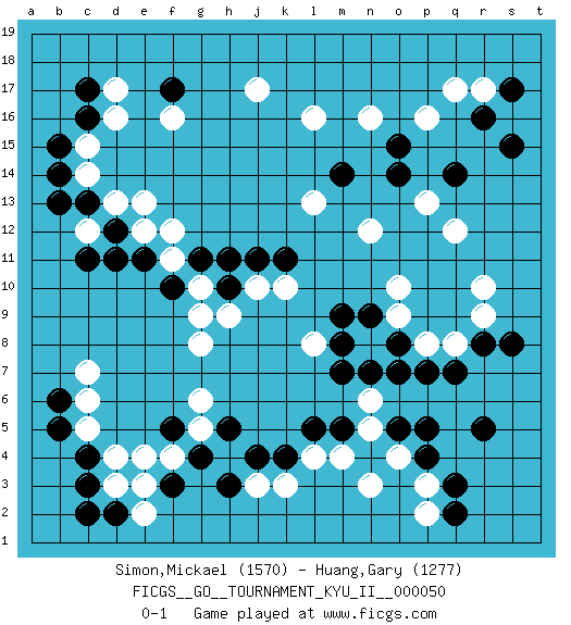 Last move : 0-1 2014 August 26 16:52:11 [Event "FICGS__GO__TOURNAMENT_KYU_II__000050"] [Site "FICGS"] [Date "2014.03.02"] [Round "1"] [Black "Simon,Mickael"] [White "Huang,Gary"] [Result "0-1"] [Rating 1 "1570"] [Rating 2 "1277"] 1.r16 d16 2.q3 p16 3.q14 r17 4.s17 q17 5.s15 d4 6.f3 j3 7.c3 d3 8.c4 c5 9.b5 c6 10.b6 c7 11.d2 e2 12.c2 e3 13.r5 r10 14.f17 j17 15.c17 d17 16.c16 c15 17.b15 c14 18.b14 f16 19.c13 d13 20.d12 c12 21.b13 e13 22.c11 e12 23.d11 n3 24.r8 q12 25.o14 n16 26.m14 q8 27.q7 p8 28.p7 r9 29.s8 p13 30.o15 l16 31.o8 o9 32.n9 n8 33.o7 o10 34.m9 n12 35.m7 n6 36.n7 l13 37.f5 f4 38.g4 e4 39.h3 g5 40.h5 g6 41.j4 k3 42.k4 l4 43.l5 m4 44.m5 p2 45.q2 p3 46.p4 o4 47.o5 n5 48.p5 l8 49.m8 g8 50.e11 f11 51.f10 g10 52.g11 f12 53.h10 g9 54.k11 j10 55.j11 h9 56.h11 k10 0-1 Here are the names of the openings (joseki) played in the four corners : Corner q16 : r16 p16 Komoku (Somok, Xiao~mu`) 3-4 Point. The komoku (3-4) point is the traditional corner enclosure move.. Ikken Takagakari (Hankan Nop'dakeolch'im, Yi Gaogua`jiao~, 1-Space High Approach). The 5-4 approach move has become more popular in modern times, as modern Go emphasizes speed and influence. Corner d4 : d4 f3 Hoshi (Hwajeom, Seongjeom, Xingwei`) 4-4 Point. The star or hoshi (4-4) point, emphasizing influence at the potential expense of territory. Ikken Kakari (Hankan Keolch'im, Yi Gua`jiao~, 1-Space Low Approach). Black 2 is the standard approach move to the 4-4. Corner d16 : d16 f17 Hoshi (Hwajeom, Seongjeom, Xingwei`) 4-4 Point. The star or hoshi (4-4) point, emphasizing influence at the potential expense of territory. Ikken Kakari (Hankan Keolch'im, Yi Gua`jiao~, 1-Space Low Approach). Black 2 is the standard approach move to the 4-4. Player White won this Go (weiqi, baduk) game. Follow this game move after move (download)Ikken tobi is never wrong. (Anonymous) Some people are so afraid to die that they never begin to live. (Henry Van Dyke)