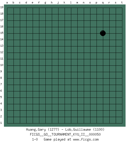 Last move : 1-0 2014 April 1 19:7:52 [Event "FICGS__GO__TOURNAMENT_KYU_II__000050"] [Site "FICGS"] [Date "2014.03.02"] [Round "1"] [Black "Huang,Gary"] [White "Lob,Guillaume"] [Result "1-0"] [Rating 1 "1277"] [Rating 2 "1100"] 1.q15 1-0 This go game has been lost on time (started : 2014.03.02 5:18:45) Here are the names of the openings (joseki) played in the four corners : Player Black won this Go (weiqi, baduk) game. Follow this game move after move (download)With only one group, you will win. (Anonymous) He who laughs last probably does not get the joke. (Unknown)