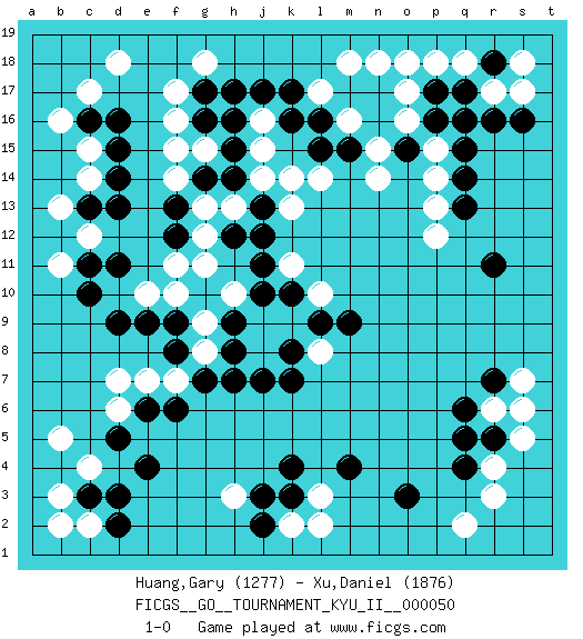 Last move : 1-0 2014 July 14 12:22:16 [Event "FICGS__GO__TOURNAMENT_KYU_II__000050"] [Site "FICGS"] [Date "2014.03.02"] [Round "1"] [Black "Huang,Gary"] [White "Xu,Daniel"] [Result "1-0"] [Rating 1 "1277"] [Rating 2 "1876"] 1.r16 c4 2.e4 d6 3.c3 b3 4.d3 b5 5.q4 h3 6.e6 d7 7.k4 l3 8.k3 k2 9.j2 l2 10.j3 q2 11.o3 r3 12.m4 r4 13.q5 r6 14.r5 s5 15.q6 s7 16.r7 s6 17.d16 f17 18.j17 f15 19.d14 d18 20.c10 c17 21.c16 o17 22.m17 r17 23.q17 q16 24.r18 s17 25.s16 q18 26.p17 p18 27.p16 o16 28.q15 p15 29.q16 s18 30.o15 p14 31.q14 p13 32.n16 n18 33.q13 p12 34.r11 n15 35.m15 n14 36.g16 f16 37.n17 o18 38.e9 l17 39.l16 m18 40.g14 e7 41.f6 f7 42.g7 g8 43.f8 g9 44.h7 c12 45.d11 c14 46.d13 c15 47.d15 b16 48.c13 b13 49.g17 j16 50.k16 g15 51.h15 j15 52.h16 j14 53.k17 g18 54.h14 f14 55.j13 b11 56.f13 j9 57.d5 c2 58.d2 b2 59.k8 j8 60.j7 l8 61.l9 e10 62.f9 f10 63.d9 g12 64.f12 f11 65.h12 g11 66.c11 g13 67.j11 k9 68.k7 l10 69.m9 k11 70.j10 h13 71.h17 k13 72.j12 l14 73.k10 h10 74.h8 m16 75.l15 k14 76.h9 1-0 Here are the names of the openings (joseki) played in the four corners : Corner d4 : c4 e4 Komoku (Somok, Xiao~mu`) 3-4 Point. The komoku (3-4) point is the traditional corner enclosure move.. Ikken Takagakari (Hankan Nop'dakeolch'im, Yi Gaogua`jiao~, 1-Space High Approach). The 5-4 approach move has become more popular in modern times, as modern Go emphasizes speed and influence. Corner q4 : q4 l3 Hoshi (Hwajeom, Seongjeom, Xingwei`) 4-4 Point. The star or hoshi (4-4) point, emphasizing influence at the potential expense of territory. Corner d16 : d16 f17 Hoshi (Hwajeom, Seongjeom, Xingwei`) 4-4 Point. The star or hoshi (4-4) point, emphasizing influence at the potential expense of territory. Ikken Kakari (Hankan Keolch'im, Yi Gua`jiao~, 1-Space Low Approach). White 2 is the standard approach move to the 4-4. Corner q16 : r16 o17 Komoku (Somok, Xiao~mu`) 3-4 Point. The komoku (3-4) point is the traditional corner enclosure move.. Niken Kakari (Dukan Keolch'im, E`r Gua`jiao~, 2-Space Low Approach). White 2 is used with friendly forces backing it up. Its purpose is to prevent a pincer. Locally it results in a loss, but may be appropriate fuseki strategy. It was popular in the late 1950s and early 1960s, but is not seen often nowadays, having been replaced by the one-space high approach, with which it has points in common. Player Black won this Go (weiqi, baduk) game. Follow this game move after move (download)The L-group is dead. (Anonymous) Looking at the proliferation of personal web pages on the Net, it looks like very soon everyone on Earth will have 15 megabytes of fame. (M.G. Sriram)